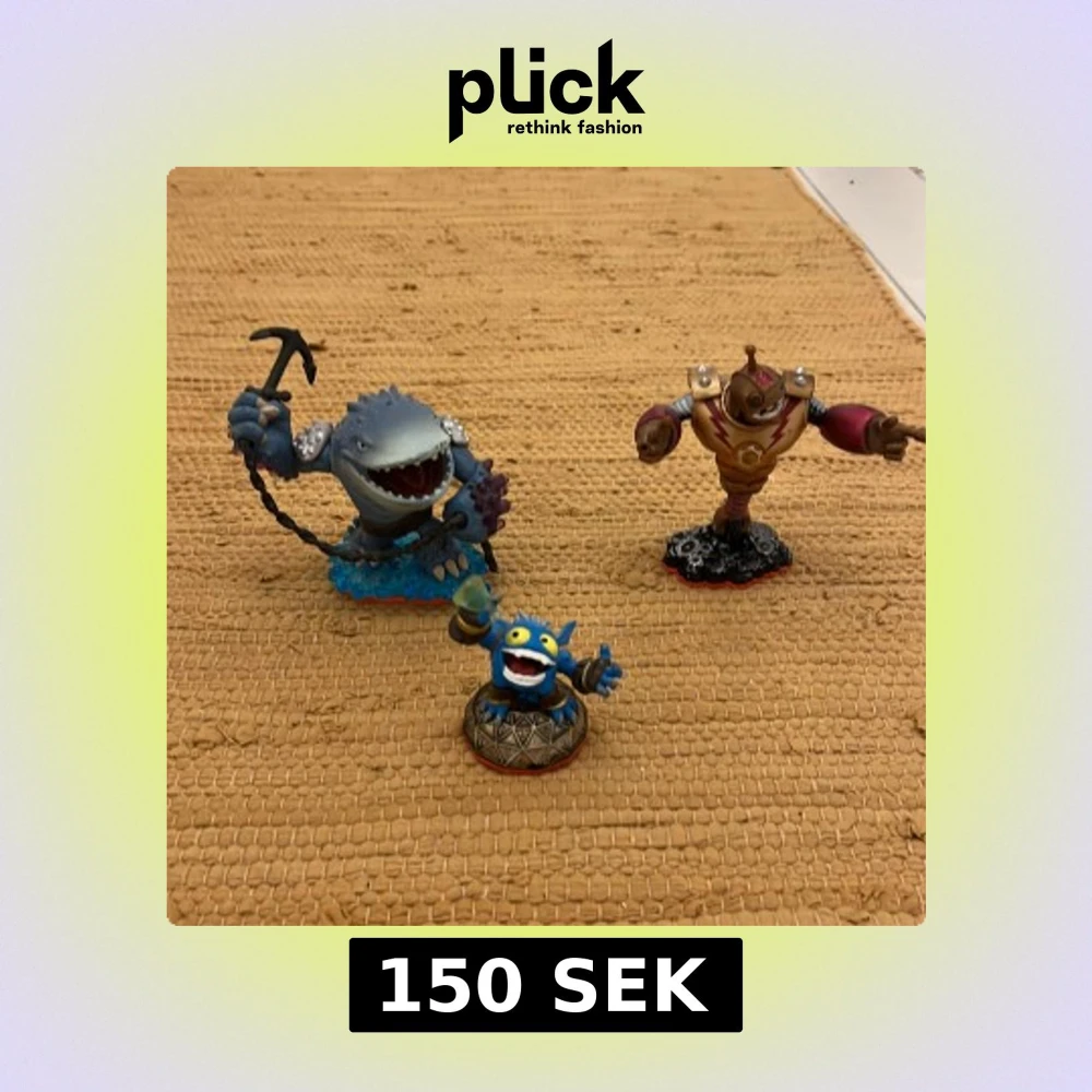Tre Skylanders-figurer i fint skick, perfekta för samlare eller spelare. Inkluderar en haj-liknande karaktär, en robot och en blå figur. Färgerna är klara och detaljerna välbevarade, inga synliga skador eller slitage.