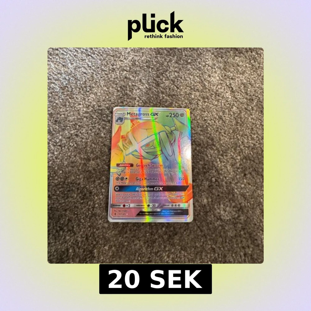 Säljer ett holografiskt Metagross GX Pokémonkort med färgstark regnbågseffekt. Kortet har 250 HP och flera attacker, inklusive Giga Hammer och Algorithm GX. Perfekt för samlare eller Pokémon-entusiaster.