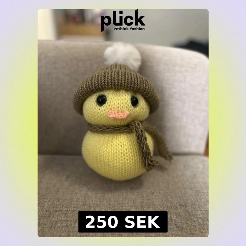 Säljer en söt gul handgjord kyckling med mössa och halsduk som går att ta av och på