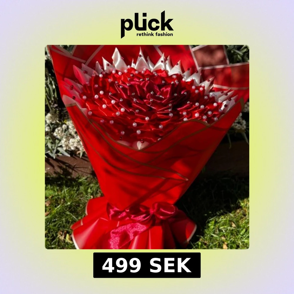 Bilden visar en vacker bukett av konstgjorda röda och vita blommor, dekorerad med pärlor och inslagen i rött papper. För mer bilder och våran vackra skapelse av evighetsrosor finns på instagram, Timeless Flowers