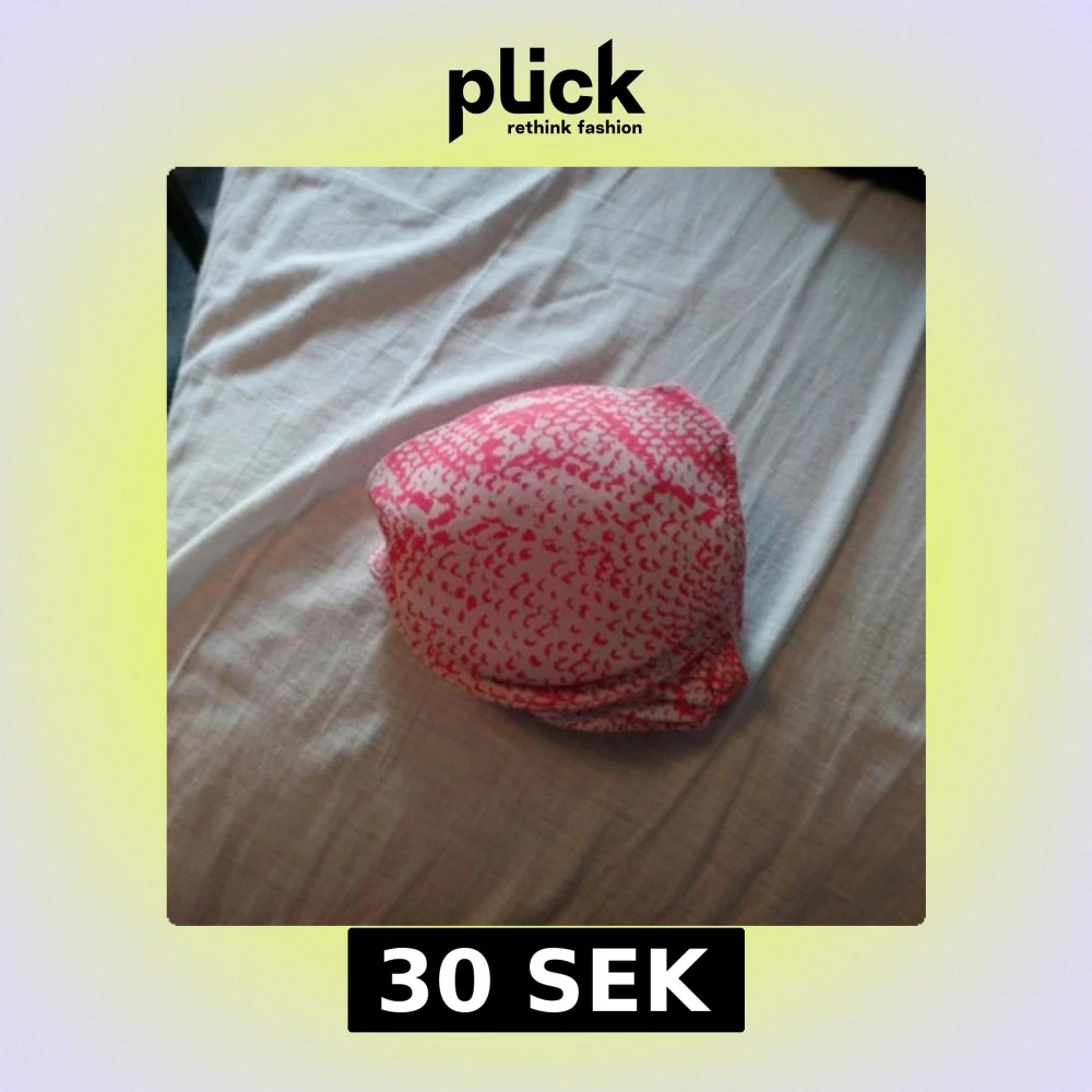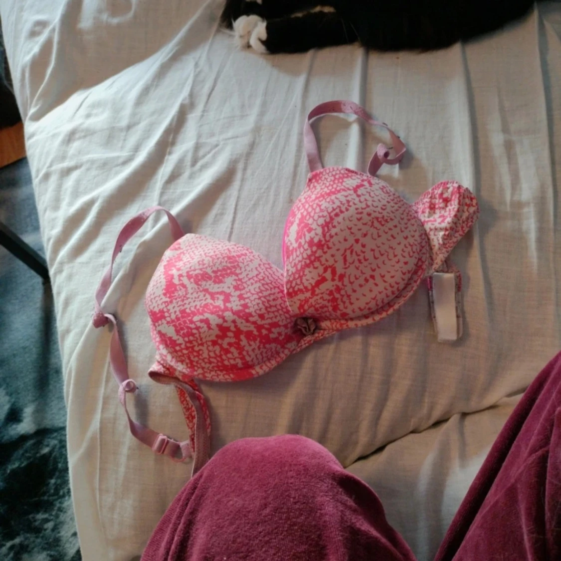 Säljer en bh med rosa och vitt mönster, vadderade kupor och justerbara axelband. Bh:n har ett unikt mönster som påminner om små prickar eller fjäll. Perfekt för dig som vill ha något färgglatt och bekvämt.