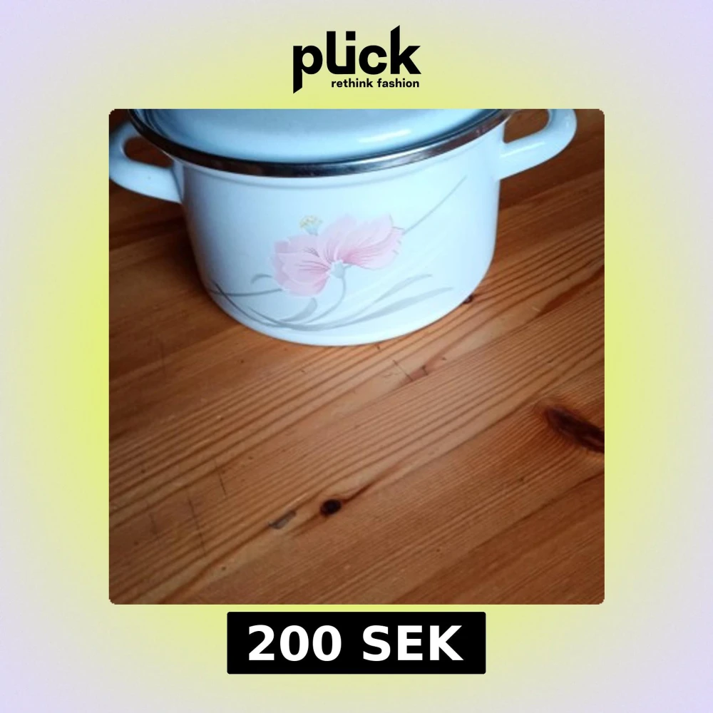Bilderna visar en vit emaljerad gryta med lock och blommotiv. Grytan har två handtag och ser ut att vara i gott skick utan synliga bucklor eller större repor. Perfekt för matlagning eller servering. Ingen elektronik syns på bilderna.