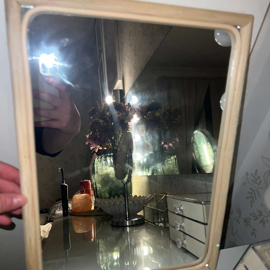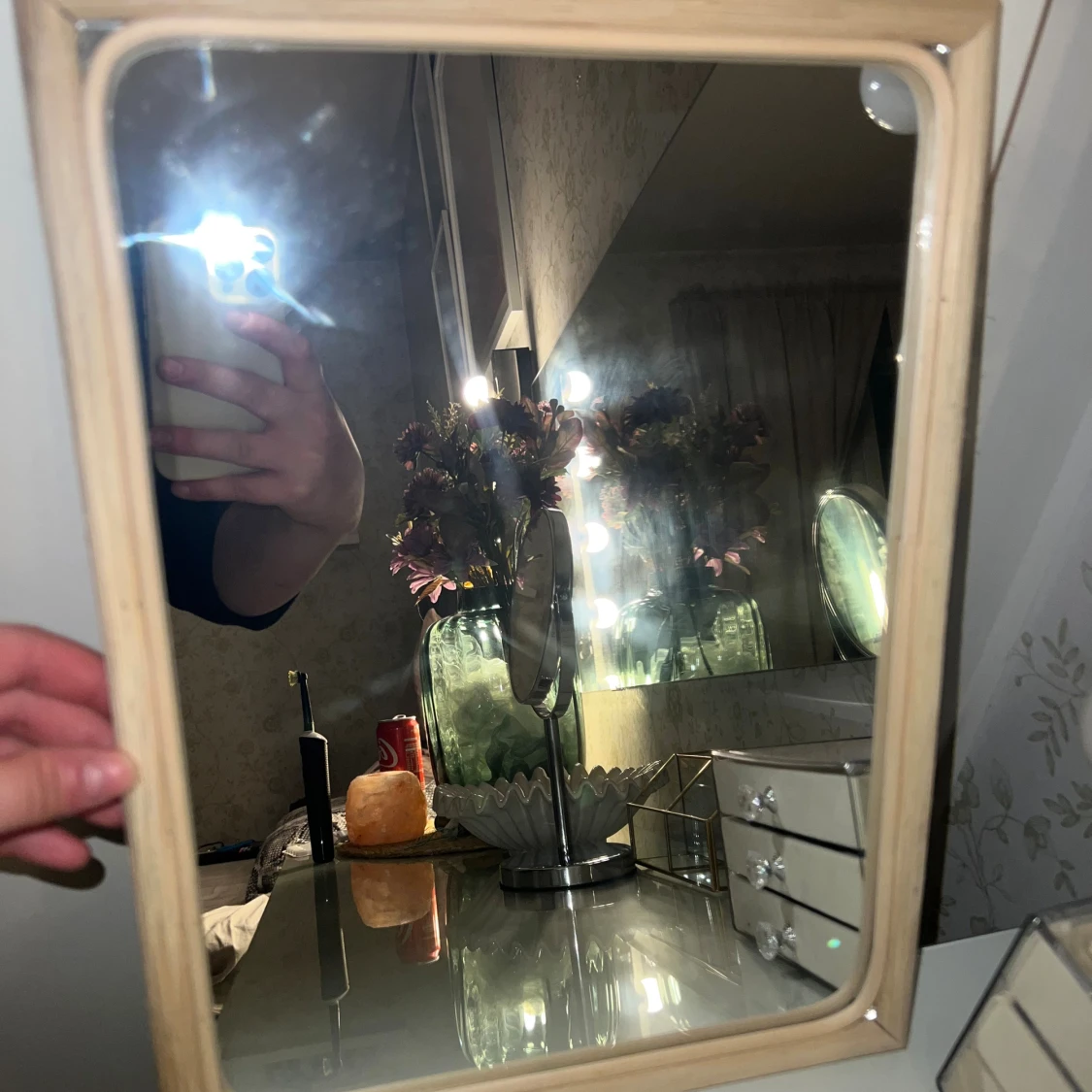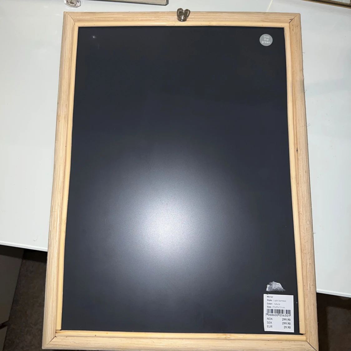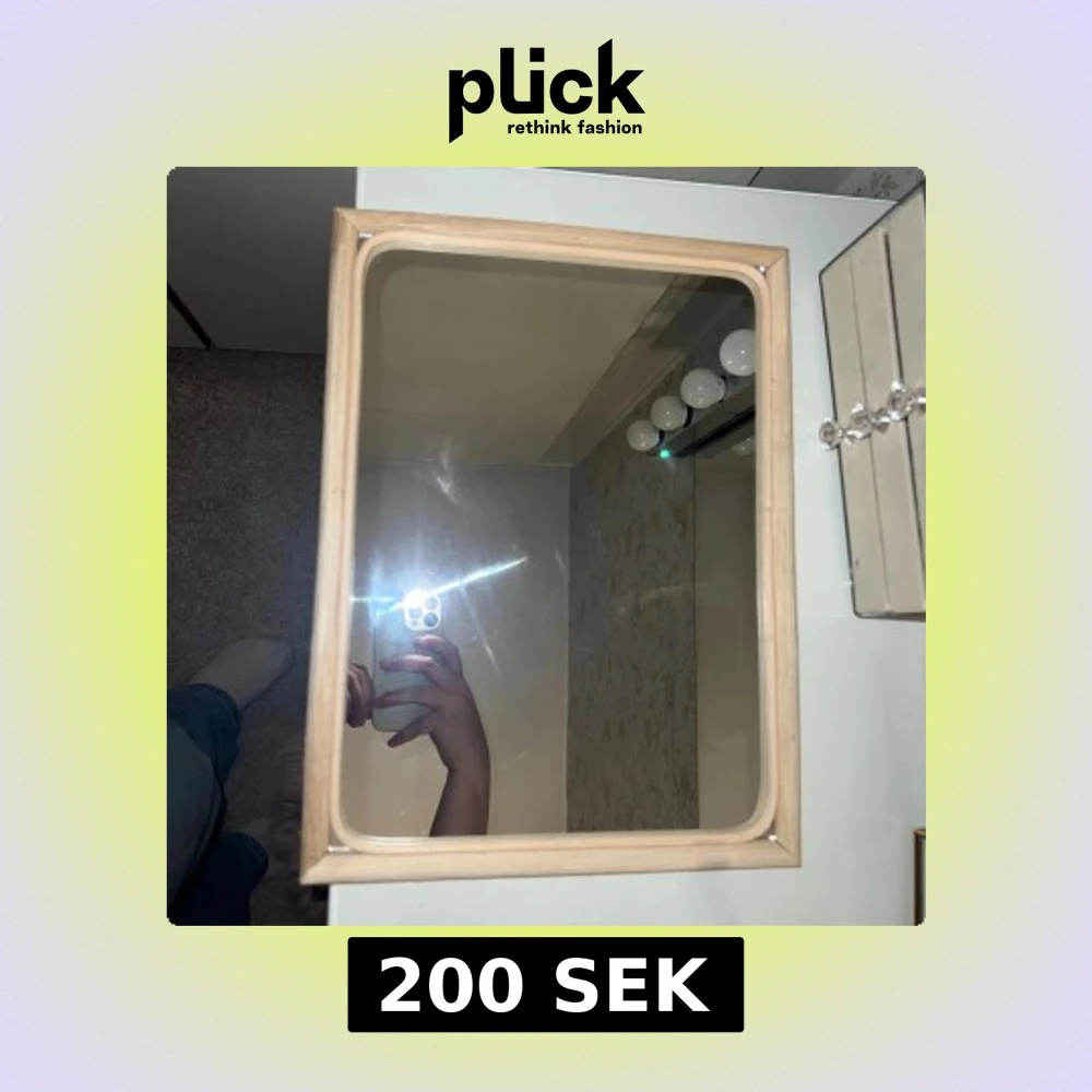 Stilren spegel med ljus bamburam från Into the Green. Spegeln är i gott skick. Perfekt för sminkbord eller hall. Enkel att hänga upp tack vare fäste på baksidan. Modern och naturlig design.