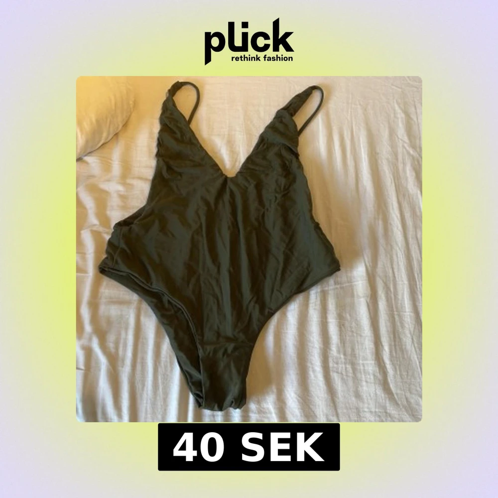 40kr Storlek S-M En stilren olivgrön baddräkt med smala axelband och djup v-ringning både fram och bak. Modellen har hög benskärning och är enkel utan mönster eller extra detaljer. Perfekt för strand eller pool.