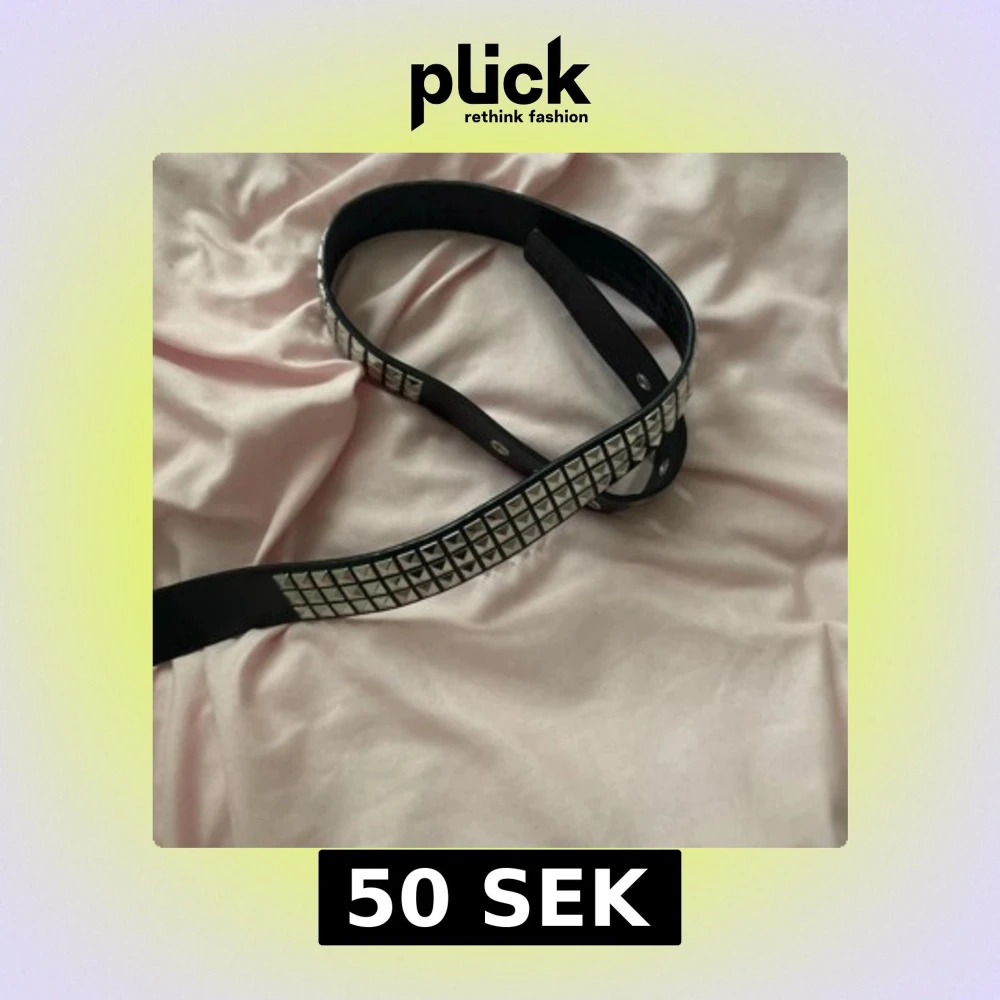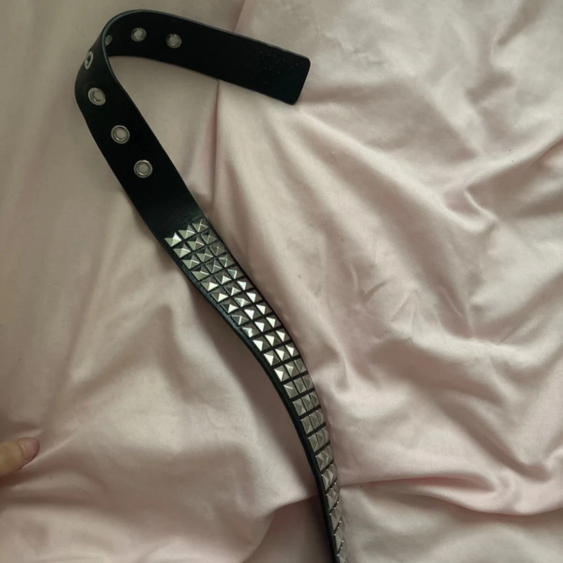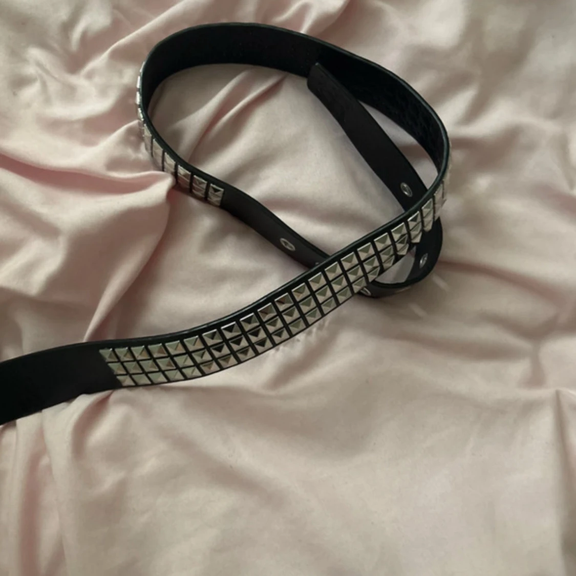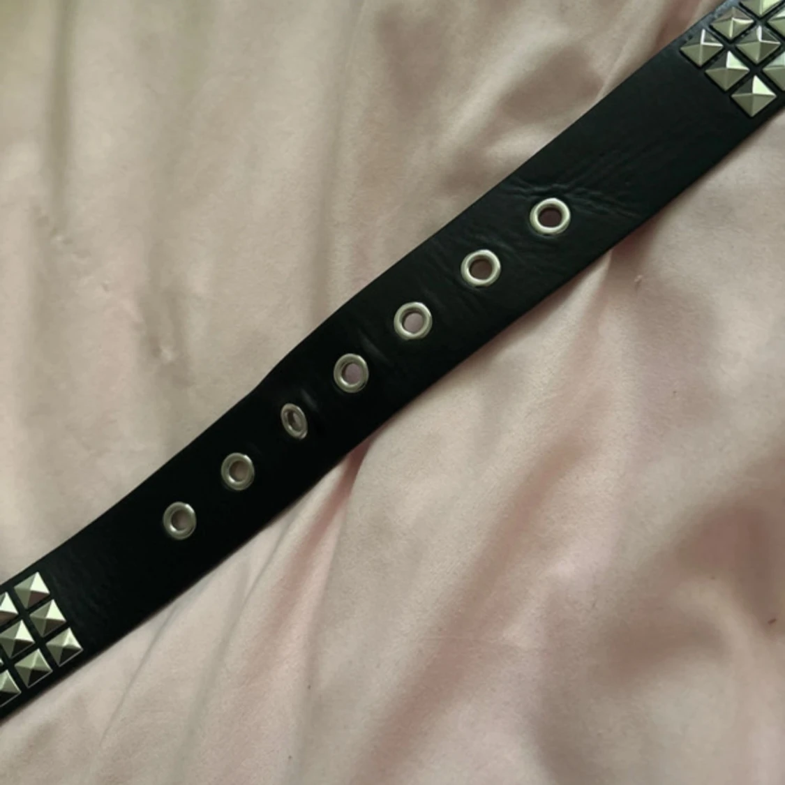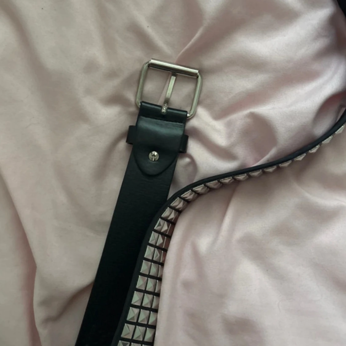Säljer ett svart bälte i skinn med fyrkantiga silverfärgade nitar längs hela bandet. Bältet har en klassisk silverfärgad spänne och flera metallhål för justering. Perfekt accessoar för att ge din outfit en edgy vibe.