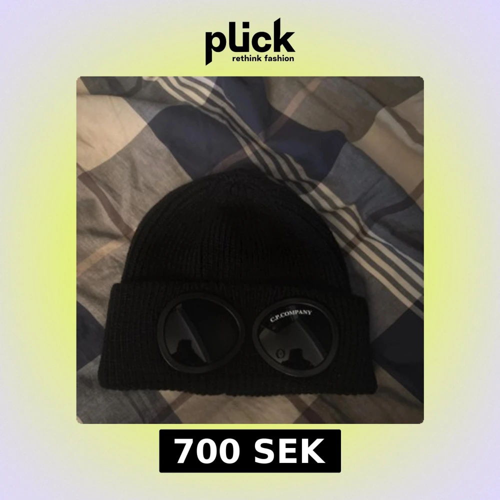 Snygg svart mössa från C.P. Company med unika glasögondetaljer framtill. Tillverkad i mjuk bomull, perfekt för kyliga dagar. En stilren accessoar som sticker ut. Endast använd 2-3 gånger, köpt i local butiken i London för 1,5 år sedan.