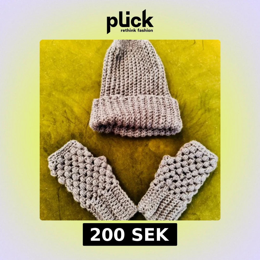 Säljer ett par grå stickade mössa och tumvantar med bubblig struktur och ribbade muddar. Perfekta för kalla dagar och ger en mysig känsla. Matchar enkelt med andra vinteraccessoarer.