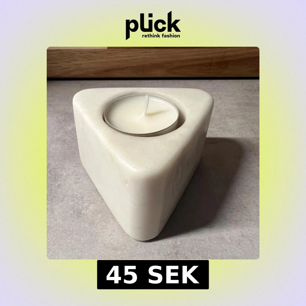 Elegant triangulär ljushållare i vit marmor, perfekt för värmeljus. Ger en modern och stilren känsla till hemmet. Inga synliga skador eller slitage, ser ut att vara i mycket gott skick. Passar utmärkt som dekoration eller present.