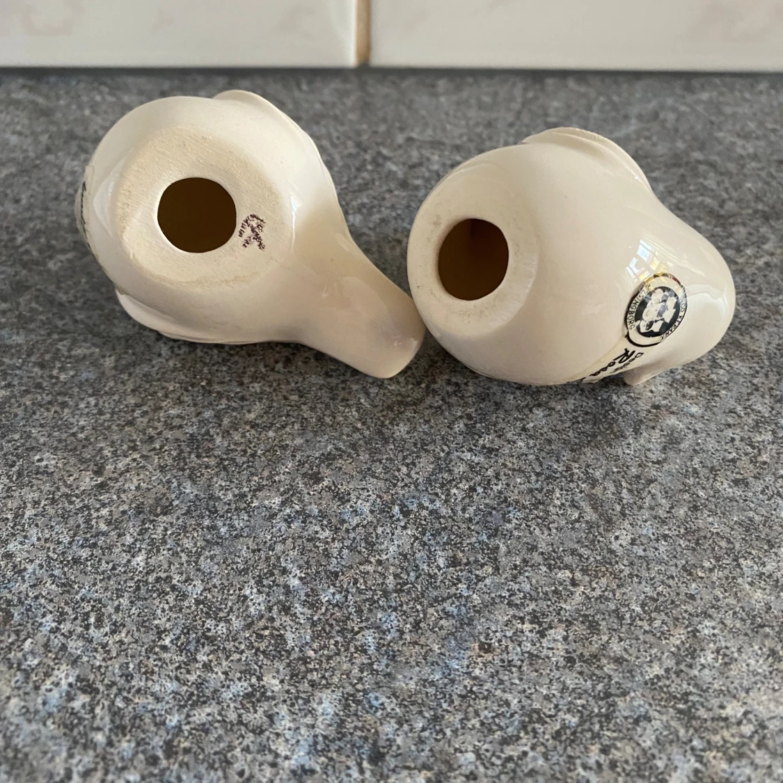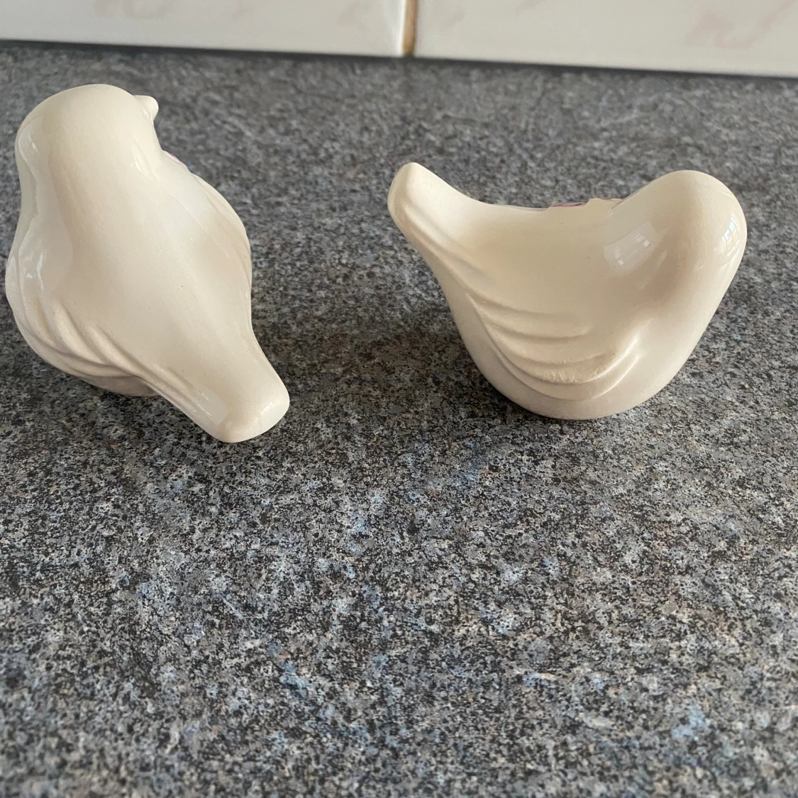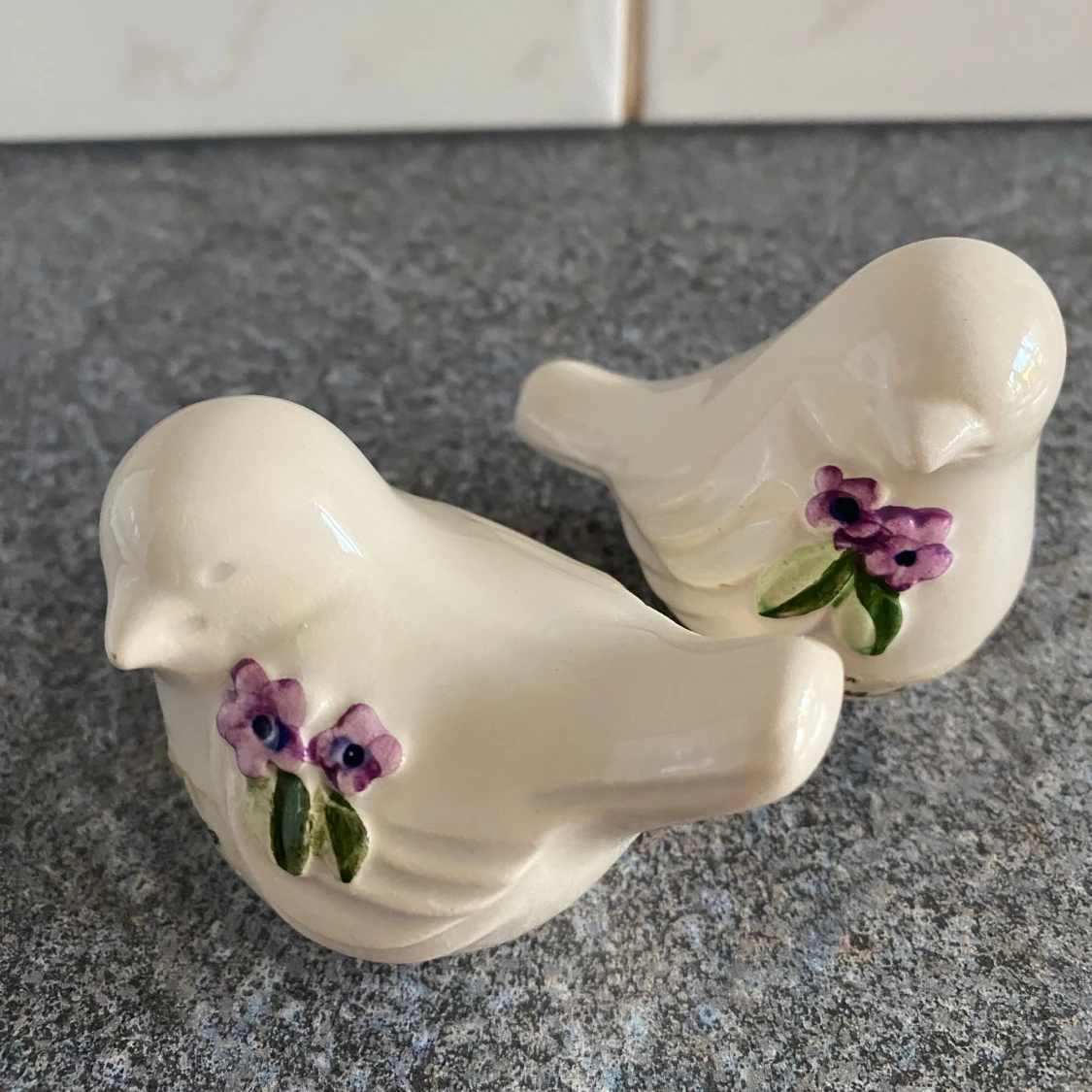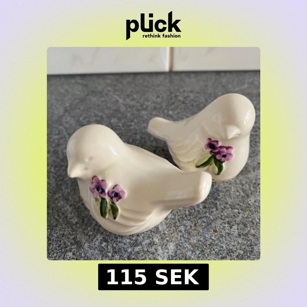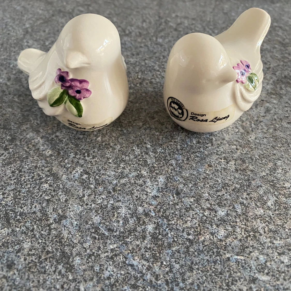 Vackra keramikfåglar från Rosa Ljung, dekorerade med lila blommor. Fint skick utan synliga sprickor eller nagg. Perfekt som prydnad eller samlarobjekt. Klassisk svensk design med charmiga detaljer.