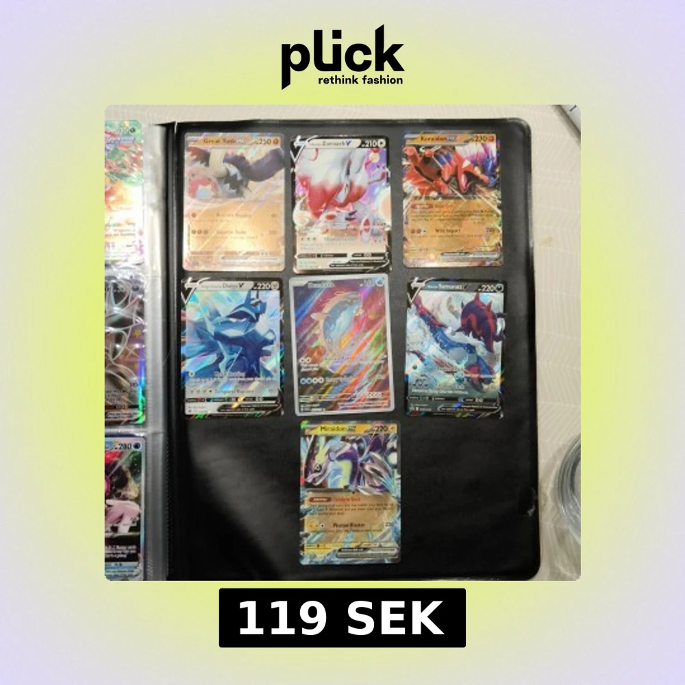 Cool samling av Pokémonkort med flera EX och V-kort! Perfekt för dig som vill boosta din samling med blanka och kraftfulla kort som Great Tusk, Koraidon, Miraidon, Dialga, Dondozo, Zoroark och Samurott. Passar både samlare och spelare som älskar Pokémon.