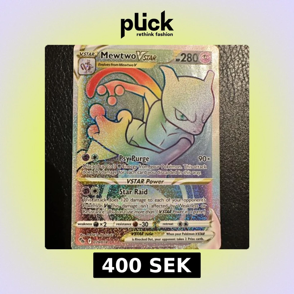 Säljer ett holografiskt Mewtwo VSTAR-kort från Pokémon TCG med 280 HP. Kortet har färgglad design med Mewtwo i fokus och attacker som Psy Purge och Star Raid. Perfekt för samlare eller spelare som vill stärka sin lek.