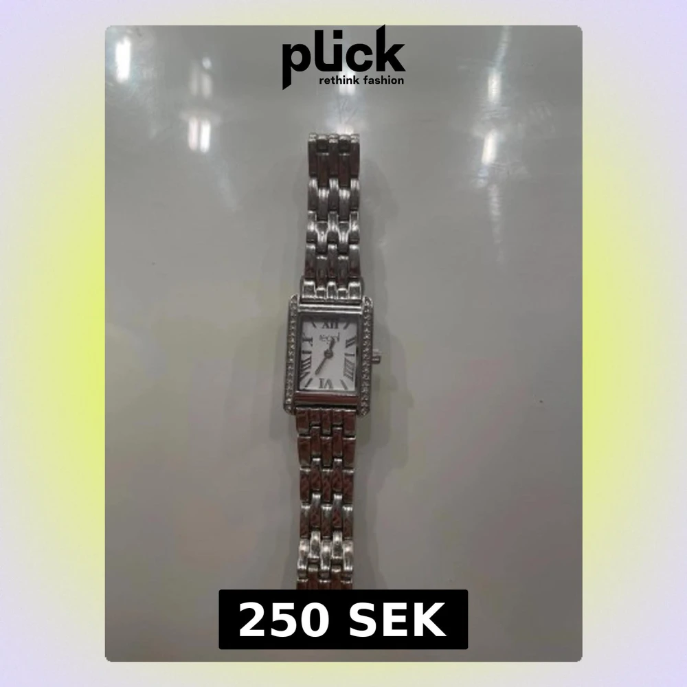 Bilderna visar en silverfärgad klocka med rektangulär urtavla och metallarmband, inte en väst. Ingen information om väst kan ges.