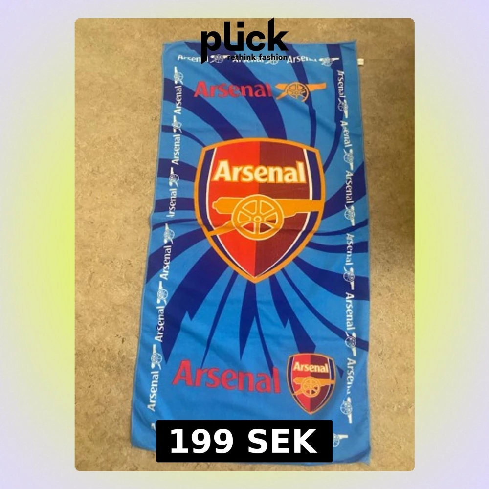 Säljer en stor blå badhandduk med Arsenal-logga och texten 'Arsenal' i rött och gult. Handduken har ett coolt mönster med kanon och klubbens emblem i mitten och längs kanterna. Perfekt för dig som älskar fotboll och vill visa ditt lag på stranden.