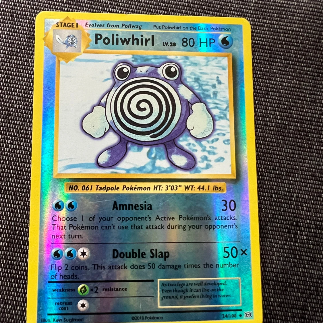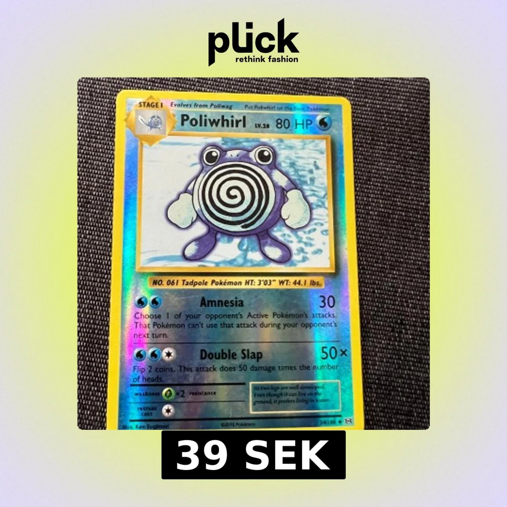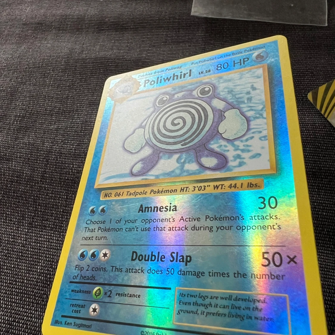 Säljer ett holografiskt Pokémonkort med Poliwhirl från 2016. Kortet har en glittrande yta och visar Poliwhirl i blå och vita färger. Kortet har 80 HP och attacker som Amnesia och Double Slap. Perfekt för samlare eller Pokémonfans!