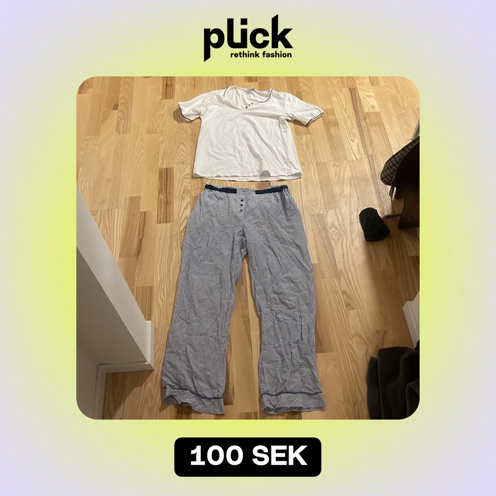 Säljer ett par bekväma randiga byxor från Damella. De är blå och vita med en loose passform och knappar framtill. Perfekta för en avslappnad dag hemma eller sommarens lata dagar. Byxorna har en elastisk midja för extra komfort.