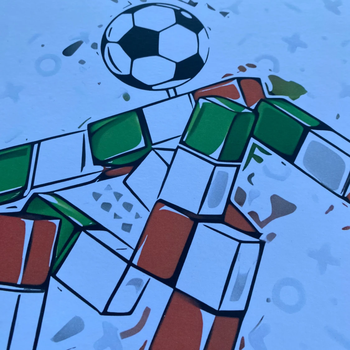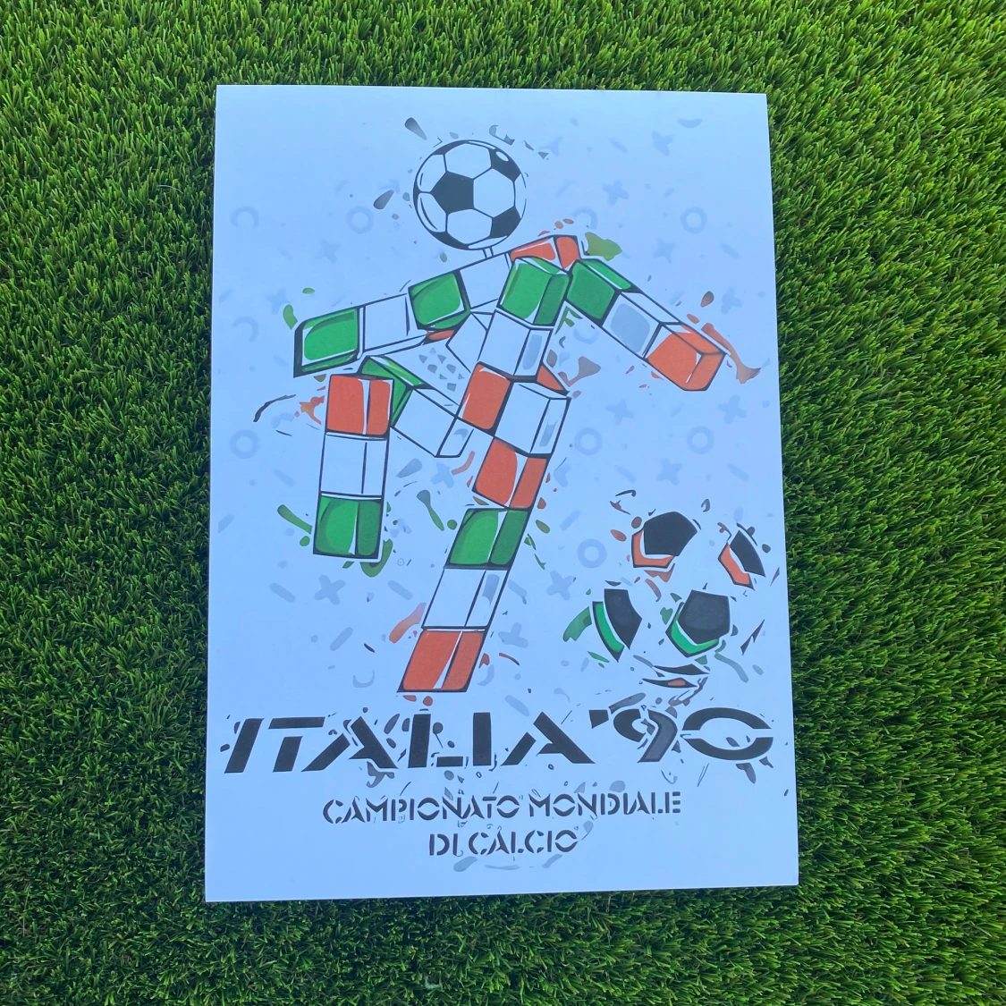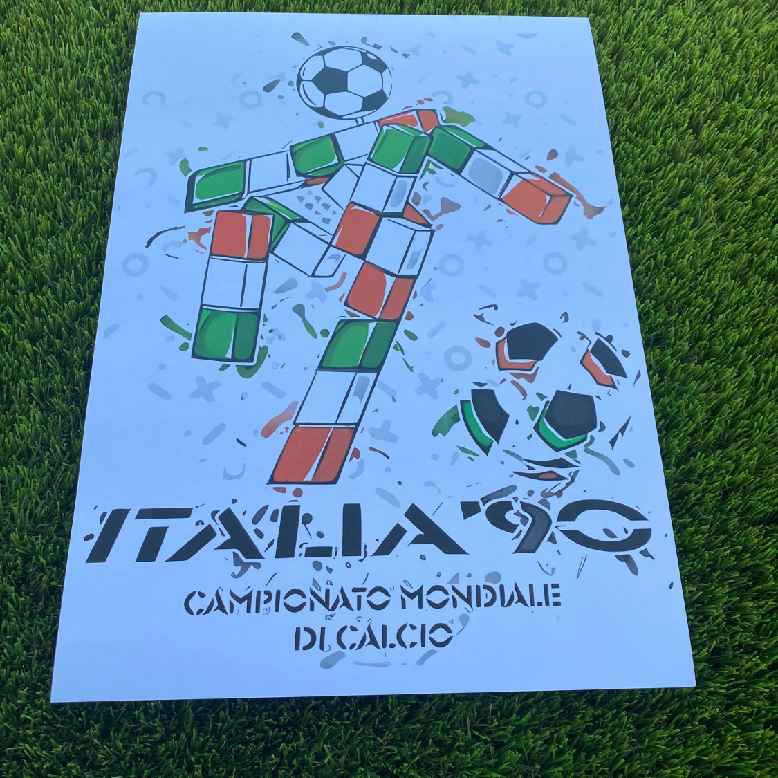 Cool poster i A3 storlek med färgstark fotbollsgrafik från VM i Italien 1990! Perfekt för dig som älskar sport, retro och fotbollskultur. Omslaget har en unik illustration med italienska flaggans färger och fotbollstema. Ett måste för samlare och sportfans!