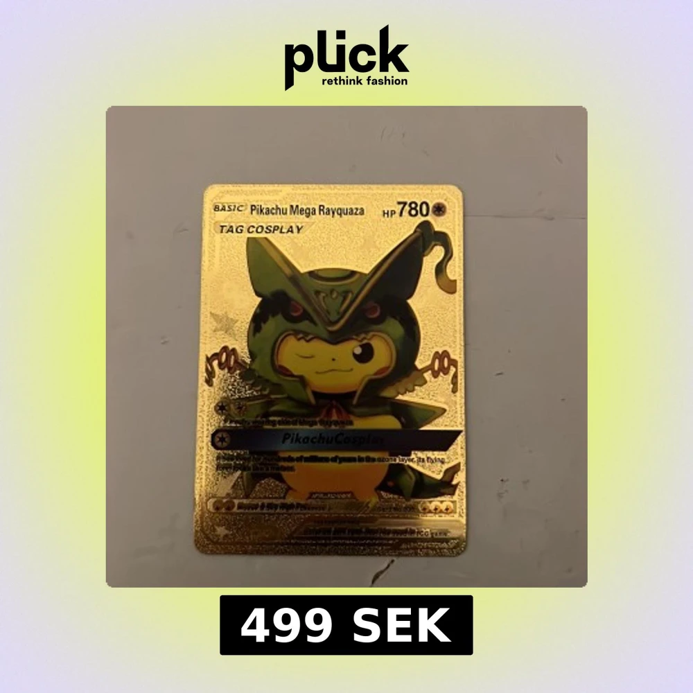 Säljer ett exklusivt Pokémonkort i guld med motiv av Pikachu utklädd till Mega Rayquaza. Kortet har en glansig, metallisk yta och är på engelska. Perfekt för samlare som gillar unika och snygga kort.