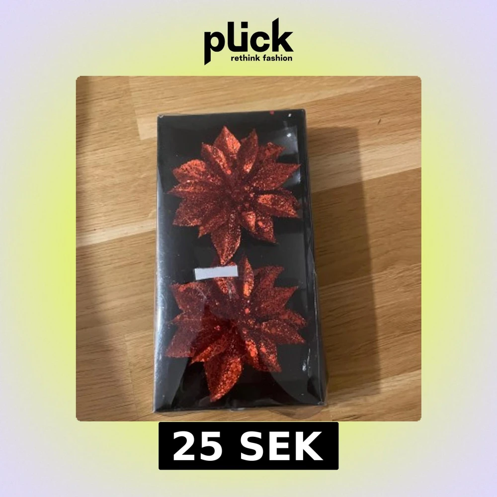 Två stora röda blommor täckta av glitter, formade som julstjärnor och förpackade i en svart ask. Perfekta som dekoration till jul eller fest. Materialet är konstgjort och blommorna har en tydlig glanseffekt.