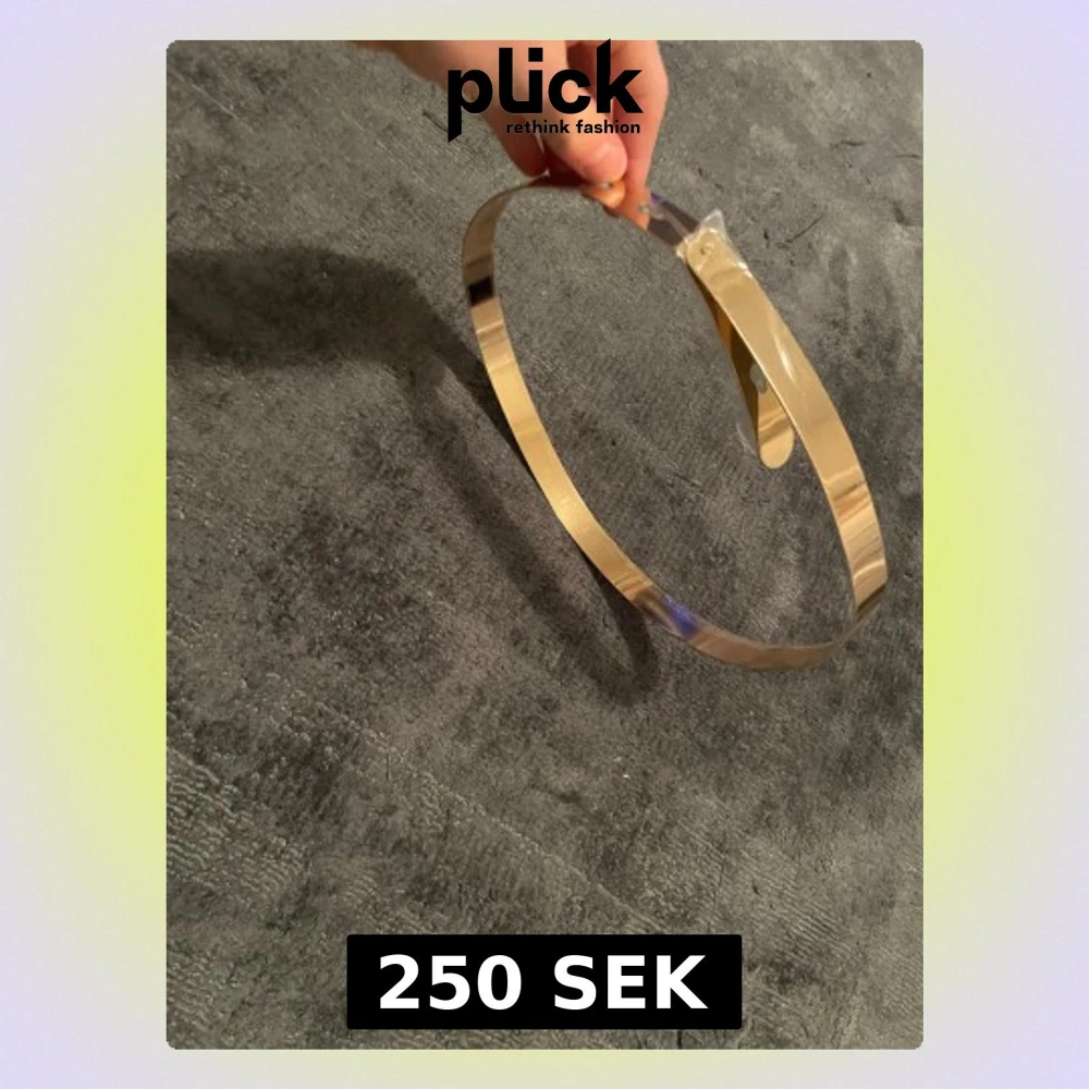 Säljer ett stilrent bälte i guldig metall med slät, blank yta och enkel design. Bältet är smalt och har en modern, minimalistisk look som verkligen sticker ut. Perfekt för att ge outfiten en extra touch av elegans och edge.