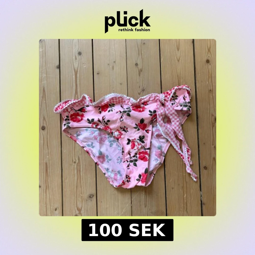 No size (snarare small/ liten M) Supersöta bikinitrosor i ljusrosa med blommigt mönster och volangkant. Sidorna har knytband i rosa och vitt rutigt tyg. Perfekt för strandhäng och sommar vibes!