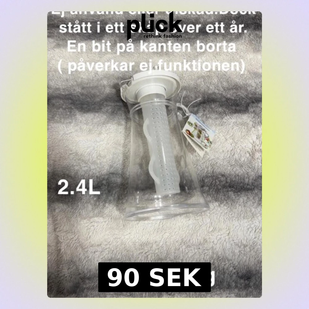 En genomskinlig karaff med infusionsrör.🌸 Aldrig använd eller diskad. Har stått i vårat skafferi över ett år och inte blivit använd. Har dock gått av en bit från kanten ( dock inget som påverkar funktionen.) finns även lite ytliga repor från att ha kommit emot andra saker. 2.4 L