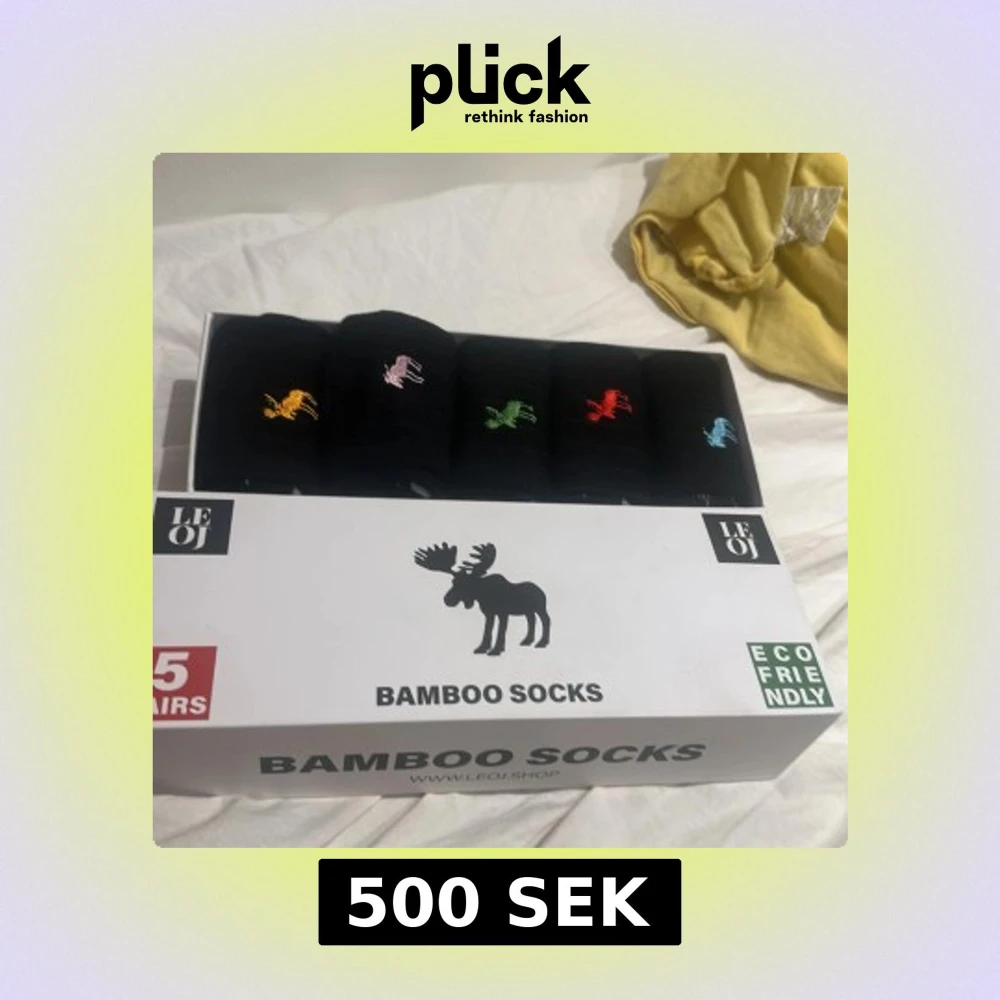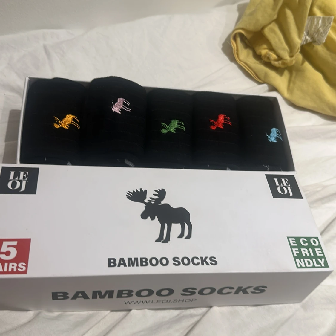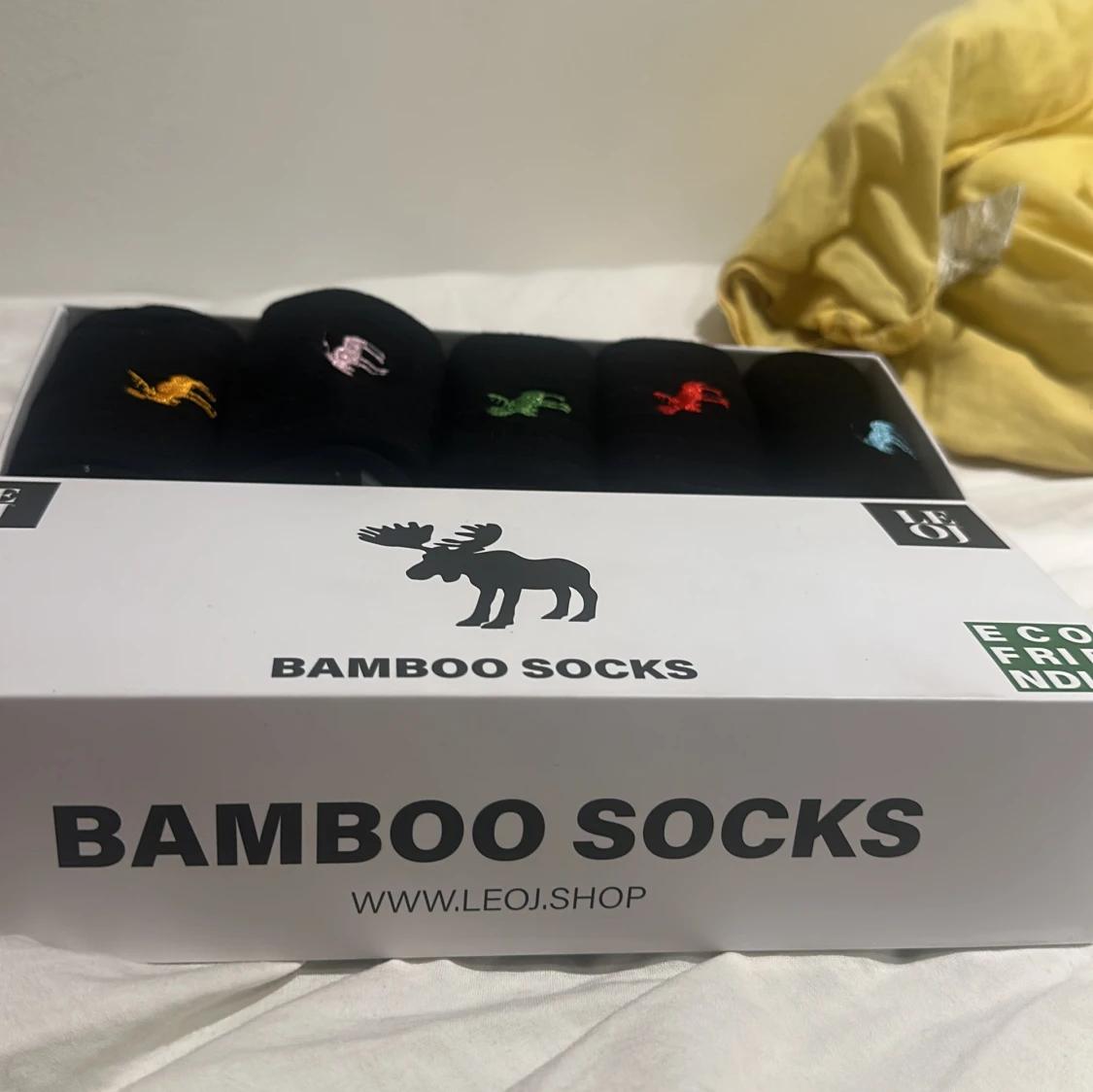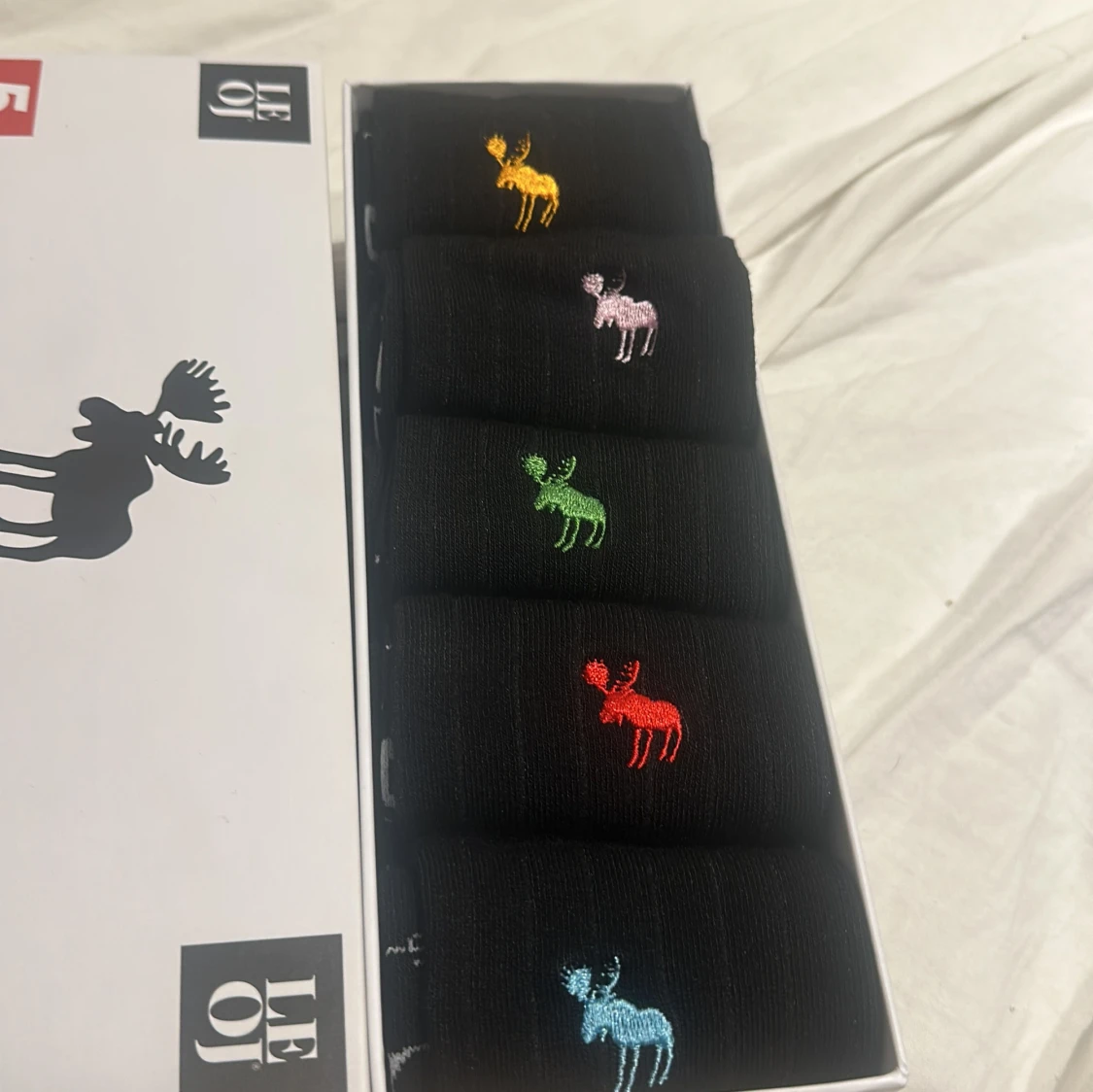 Fem par svarta bambustrumpor från LEOJ med broderade älgar i olika färger: gul, rosa, grön, röd och blå. Strumporna är mjuka och andas bra tack vare bambumaterialet. Perfekt för dig som gillar lite färg och vill ha något unikt på fötterna.