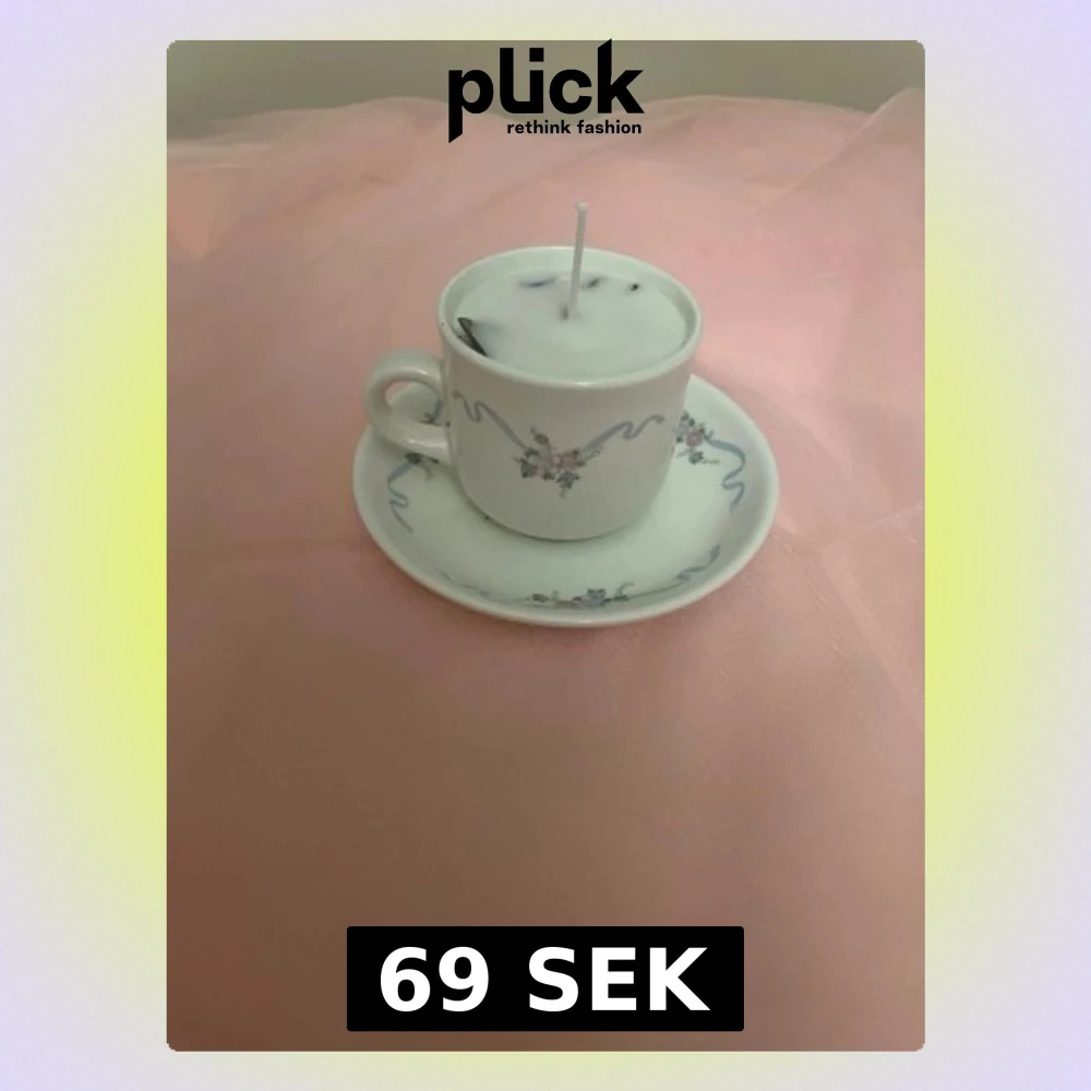 Det här ljuset är gjort av återanvändbara material. Tekoppen är köpt secondhand och stearinet är från kyrkor som tänkte slänga det. Det här ljuset har en svag doft utav vanilj, så känsliga även kan använda det. Det här ljuset har även torkade blommor på som dekoration. Det finns fler av denna design på hemsidan om man vill köpa sets.