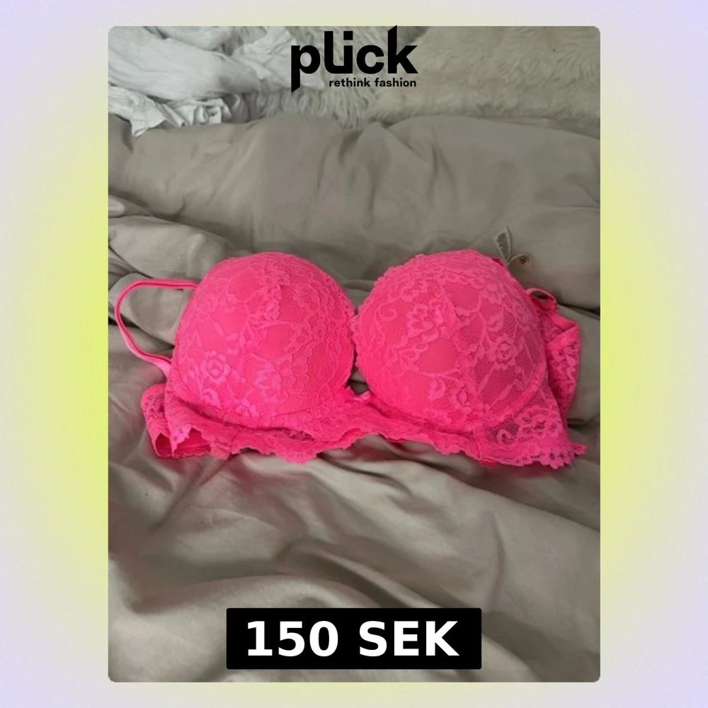Snygg neonrosa bh med vadderade kupor och justerbara axelband. Bh:n är täckt av blommig spets och har fina spetsdetaljer längs kanterna. Perfekt för dig som vill ha något färgstarkt och extra.