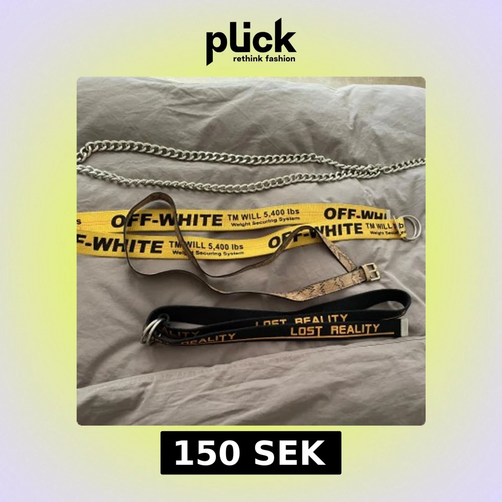 Säljer fyra bälten: ett chunky kedjebälte i silver, ett gult Off-White-bälte (INTE ÄKTA), ett smalt bälte i ormmönstrad mocka och ett svart Lost Reality-bälte med gul text.