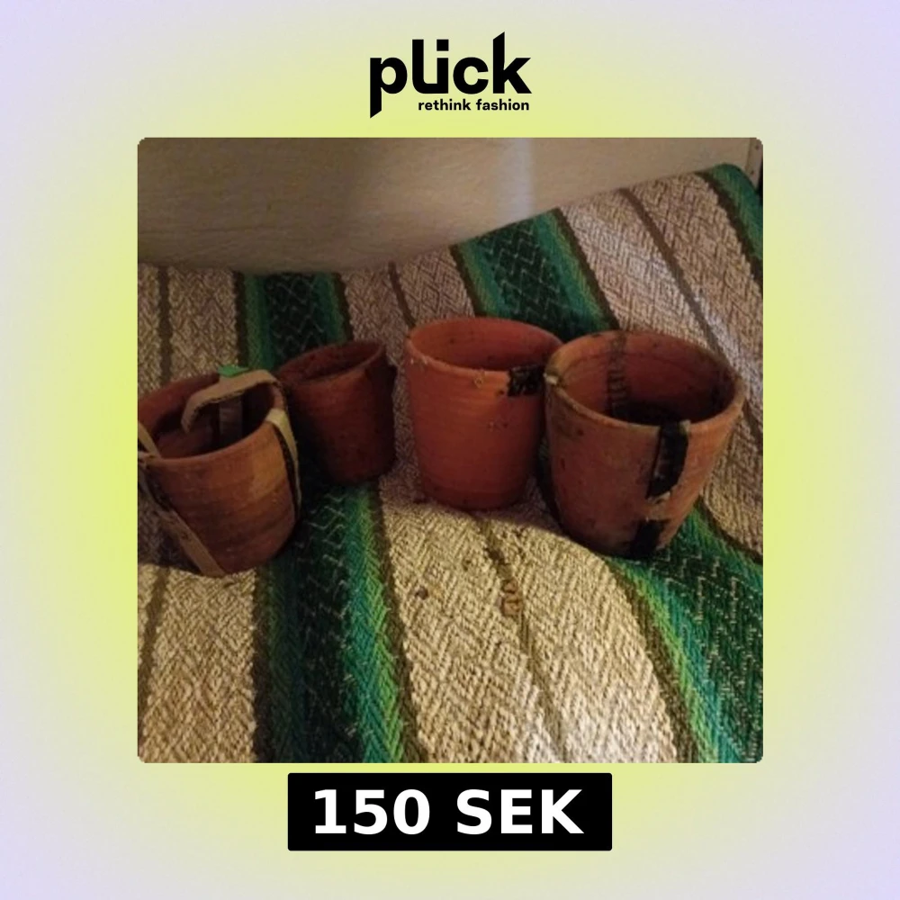 Fyra terrakottakrukor i olika storlekar, perfekta för plantering. De har en rustik känsla och är placerade på en grön- och vitrandig filt.