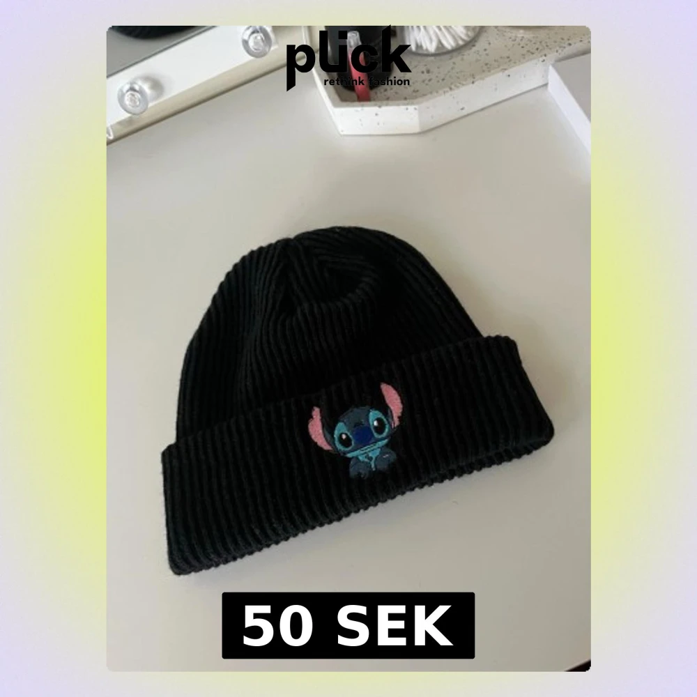 Svart ribbstickad mössa med uppvikt kant och ett broderat motiv av Stitch framtill. Mössan är mjuk och har en klassisk form som sitter skönt på huvudet. Perfekt för dig som gillar Disney och vill ha en unik accessoar. Till barn