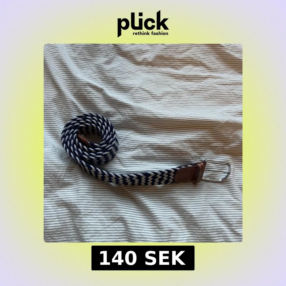 Säljer ett snyggt blåvitt flätat bälte med bruna skinn-detaljer och silverfärgat spänne. Bältet har ett mönster av blå och vita ränder och passar perfekt till jeans eller chinos.