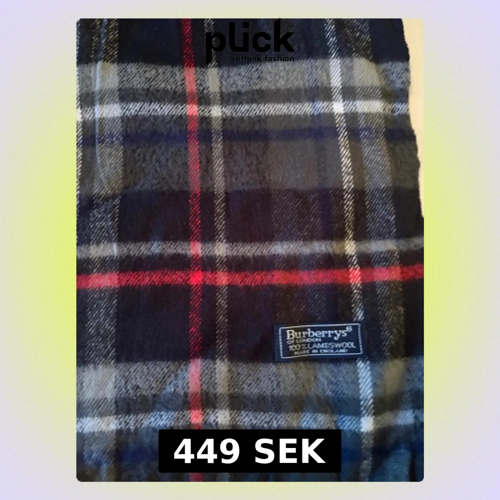 Snygg rutig halsduk från Burberrys i 100% lammull. Färgerna är mörkblå, grå, vit och röd med klassiskt rutmönster. Halsduken har fransar i kanterna och är mjuk och varm, perfekt för kyliga dagar. Märke och material syns tydligt på etiketten.