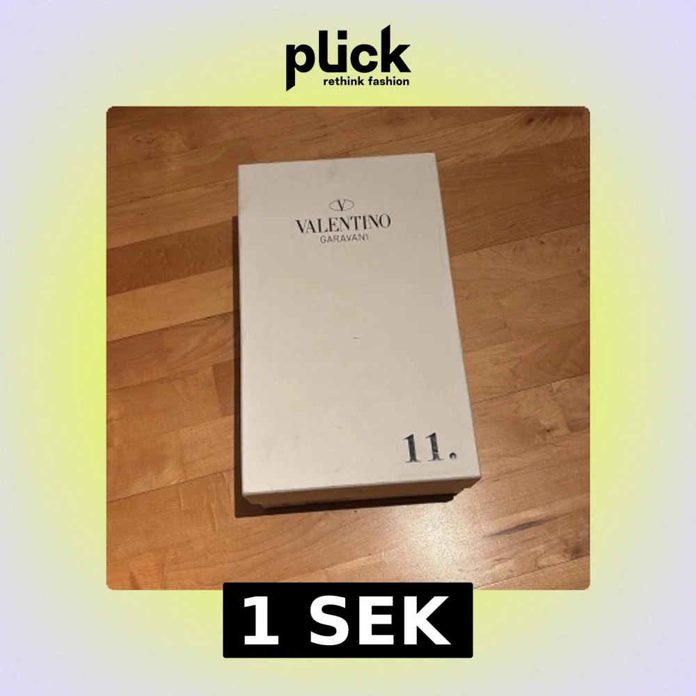 Vit skokartong från Valentino Garavani med storlek 11 angiven på framsidan. Perfekt för förvaring eller transport av exklusiva skor.