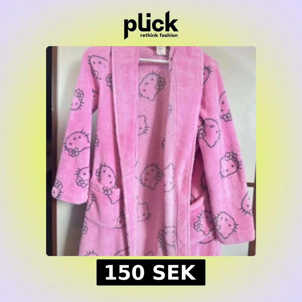 Supermysig rosa morgonrock med Hello Kitty-mönster över hela. Jackan har långa ärmar, stora fickor och en skön krage. Perfekt för dig som älskar gulliga och lekfulla plagg. Sitter löst och är riktigt mjuk mot huden.