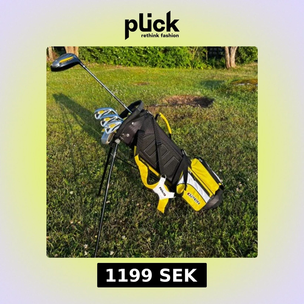 Golfbag från Open i sportig design med gula, svarta och vita detaljer. Utrustad med flera fack, dubbla axelremmar och praktiskt stativ för att stå stadigt på gräset. Tillverkad i slitstark syntet och polyester, perfekt för golfbanan. Sido facket är trasigt men det går att laga. Ny pris 1600 + driver för 600kr. Så erbjuder ett riktigt bra pris