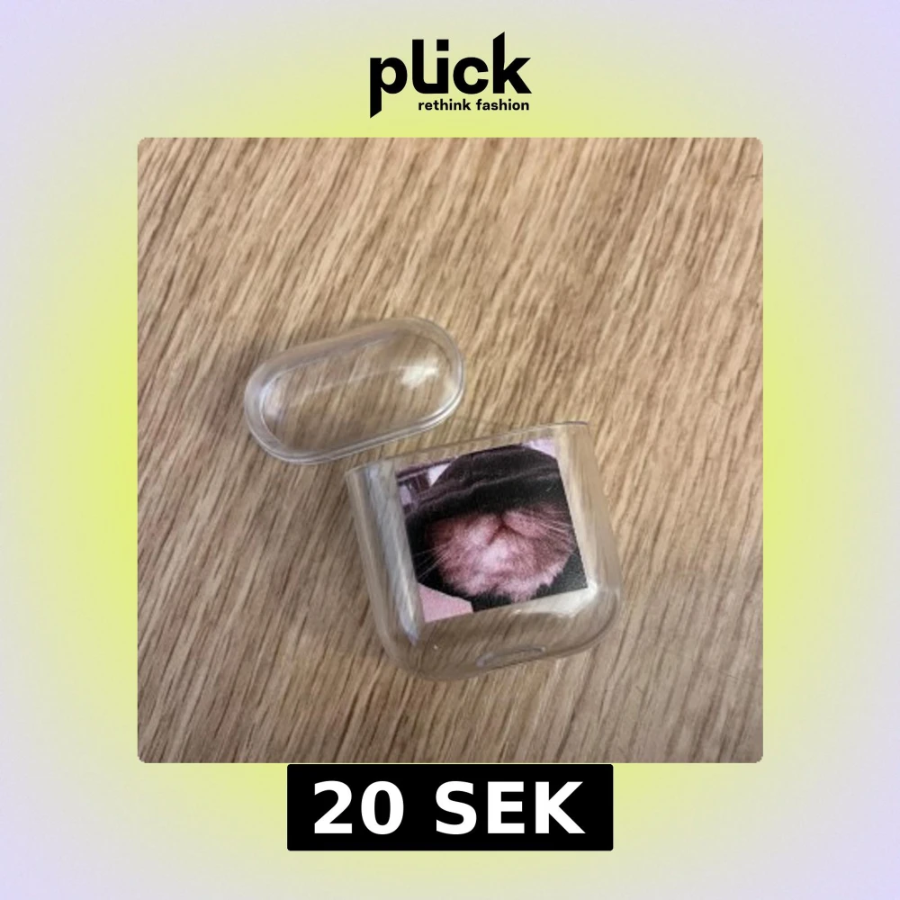Säljer ett genomskinligt AirPods-fodral i plast med ett roligt kattmotiv på framsidan. Fodralet har en enkel, rundad form och skyddar dina hörlurar samtidigt som det ger en personlig touch. Perfekt för dig som vill ha något unikt och kul till dina AirPods.