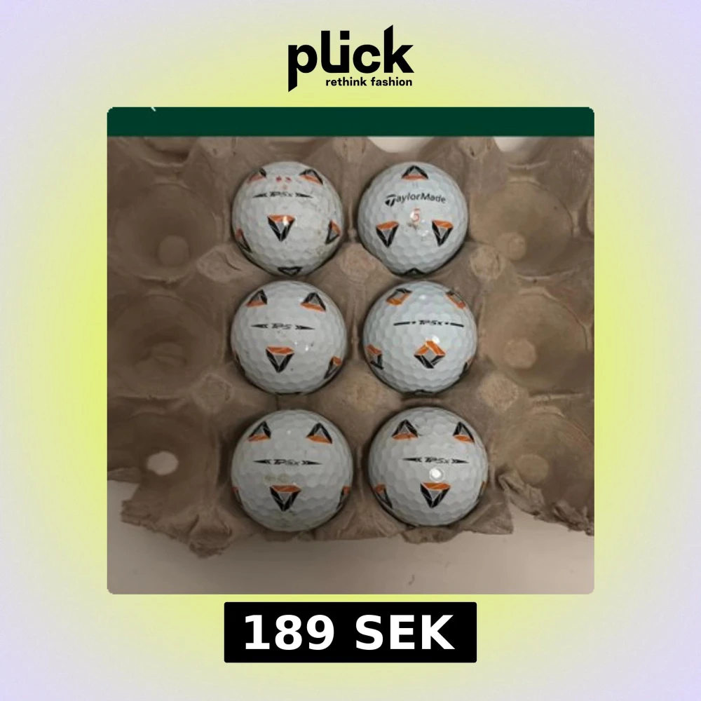 Bilderna visar golfbollar av märket TaylorMade TP5 och TP5x, placerade i en äggkartong. Det finns ingen bok synlig på bilderna, endast sportutrustning för golf.