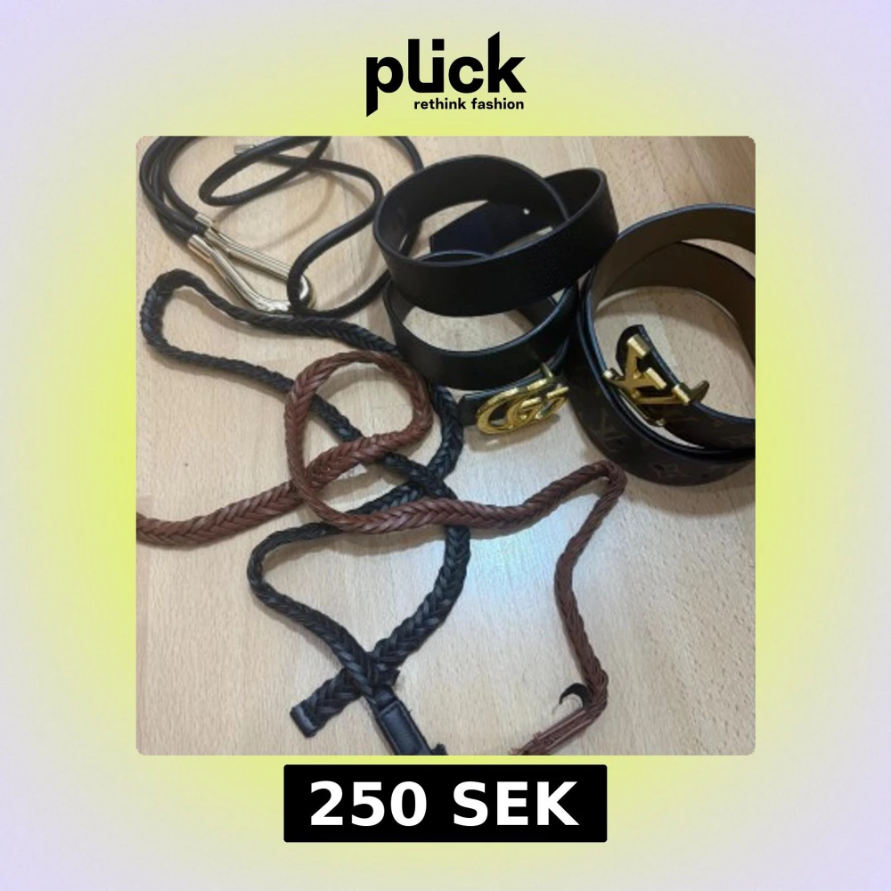 En samling av bälten i olika stilar och färger. Inkluderar flätade bälten i brunt och svart, samt bredare bälten med guldspännen. Perfekt för att komplettera olika outfits. 250kr för allt