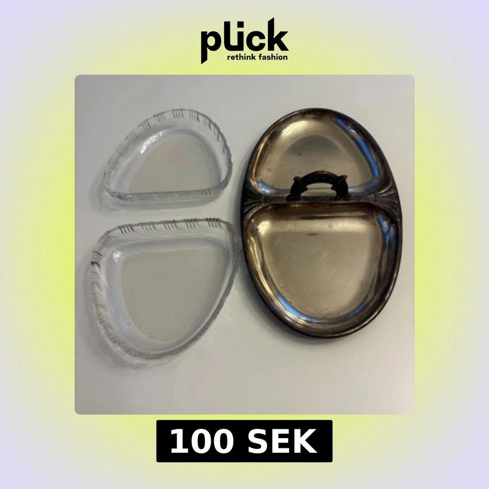 Unikt ovalt smyckesfat i silverfärgad metall med två löstagbara glasinsatser. Fatet har en dekorativ handtag i mitten och glaset har ett mönstrat kant. Perfekt för att förvara ringar, armband eller örhängen på sminkbordet.