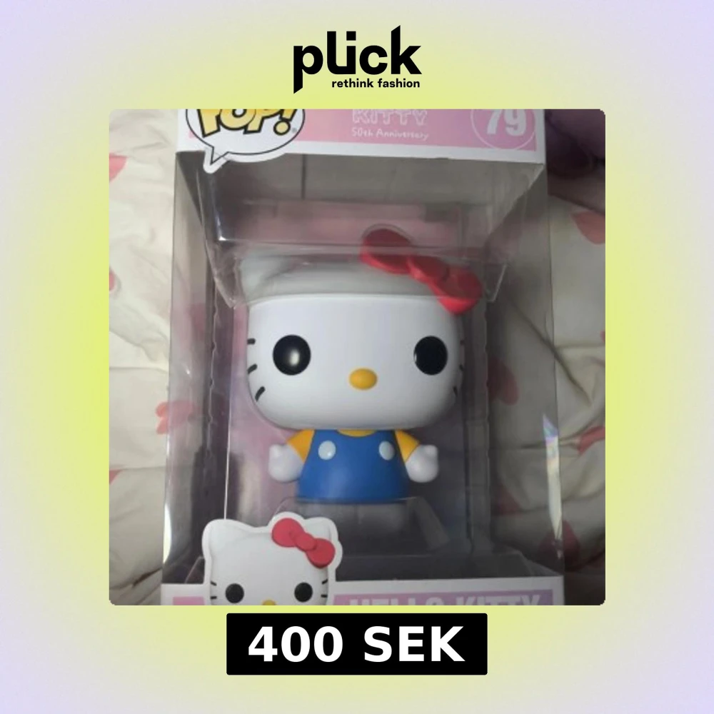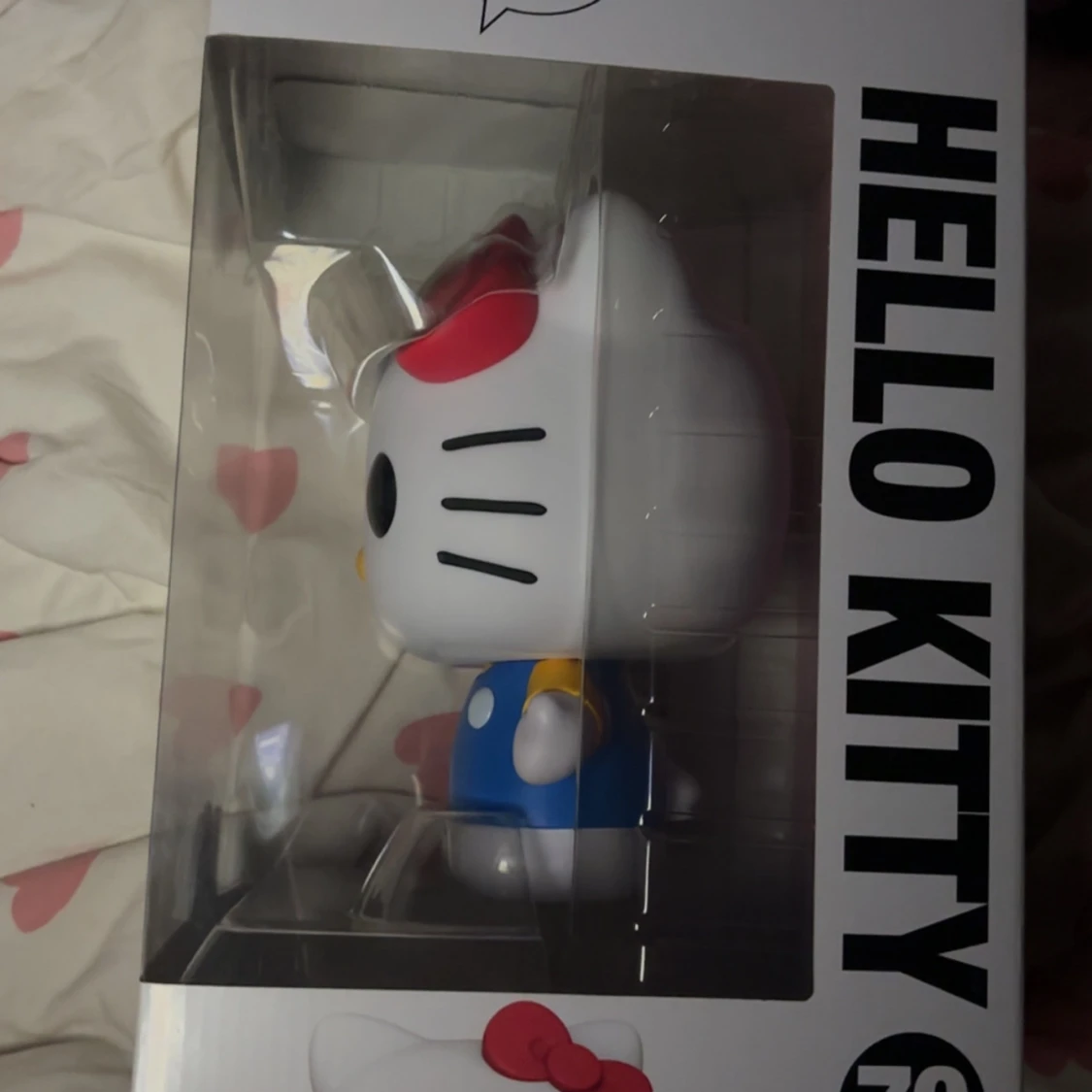Stor Funko Pop! Hello Kitty 50th Anniversary #79, ca 31,5 cm hög. Figuren är i originalförpackning och ser ut att vara i nyskick utan synligt slitage. Perfekt för samlare och Hello Kitty-fans. Söt design med blå klänning och röd rosett.