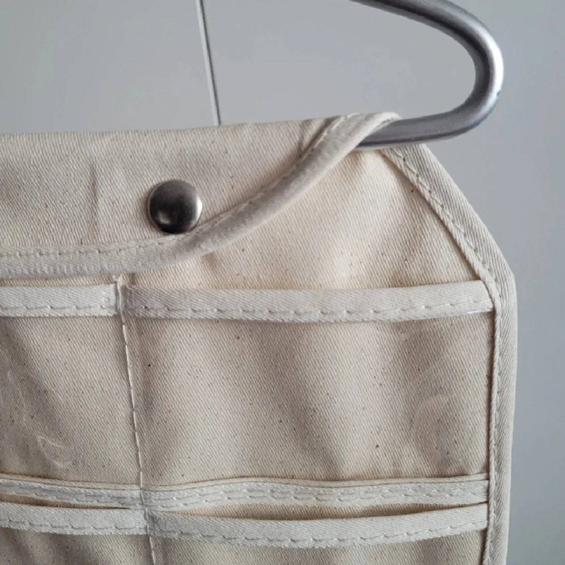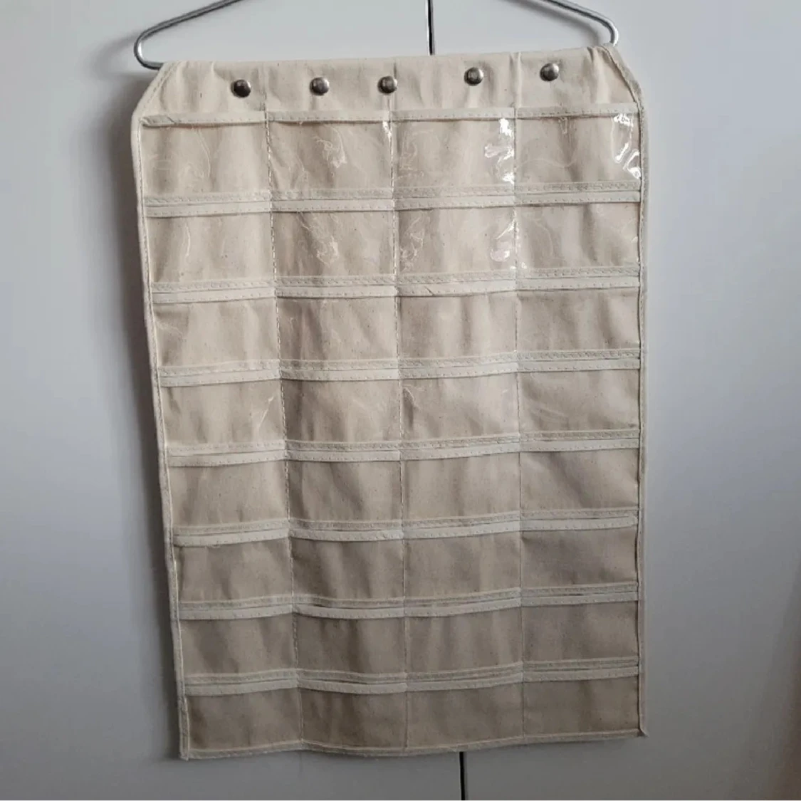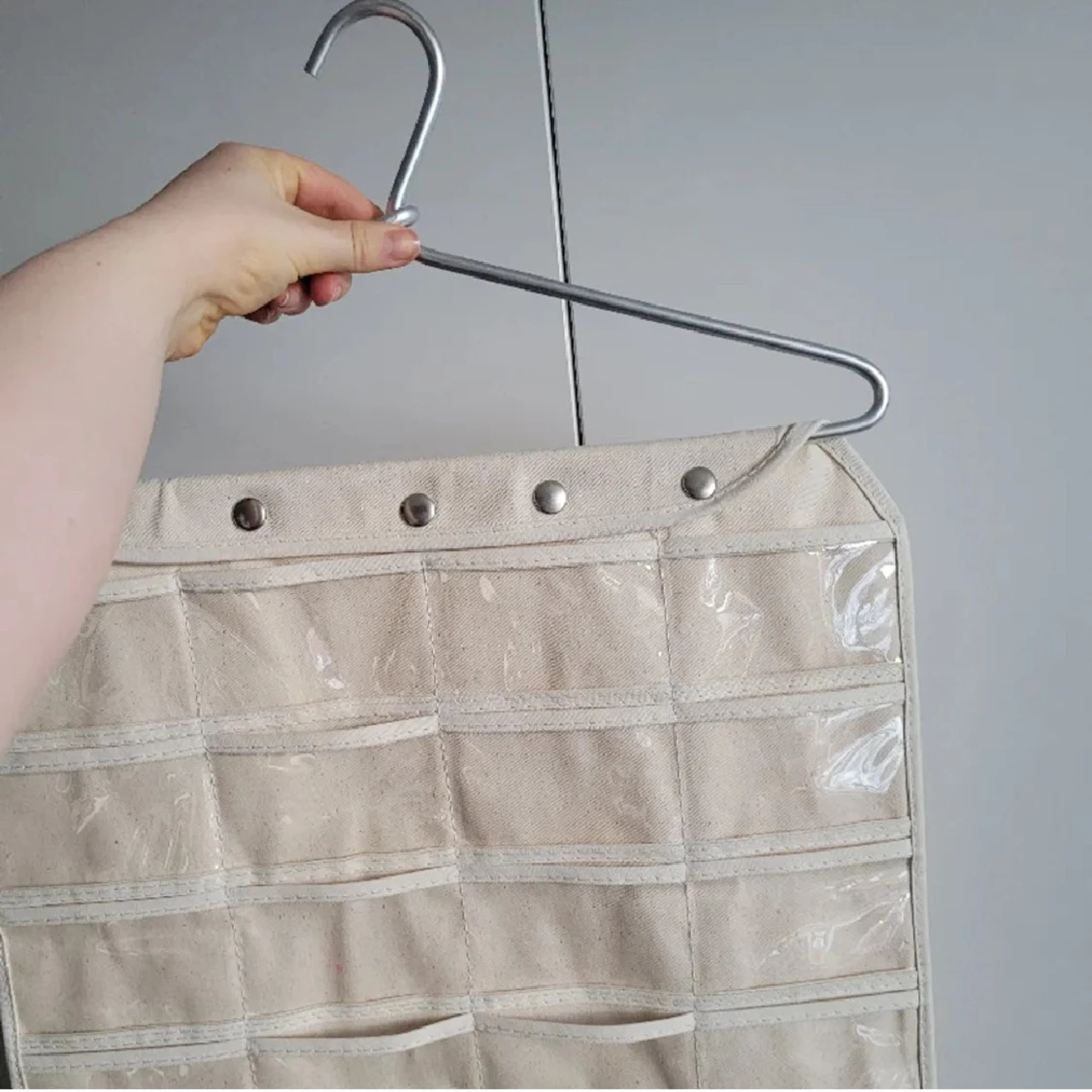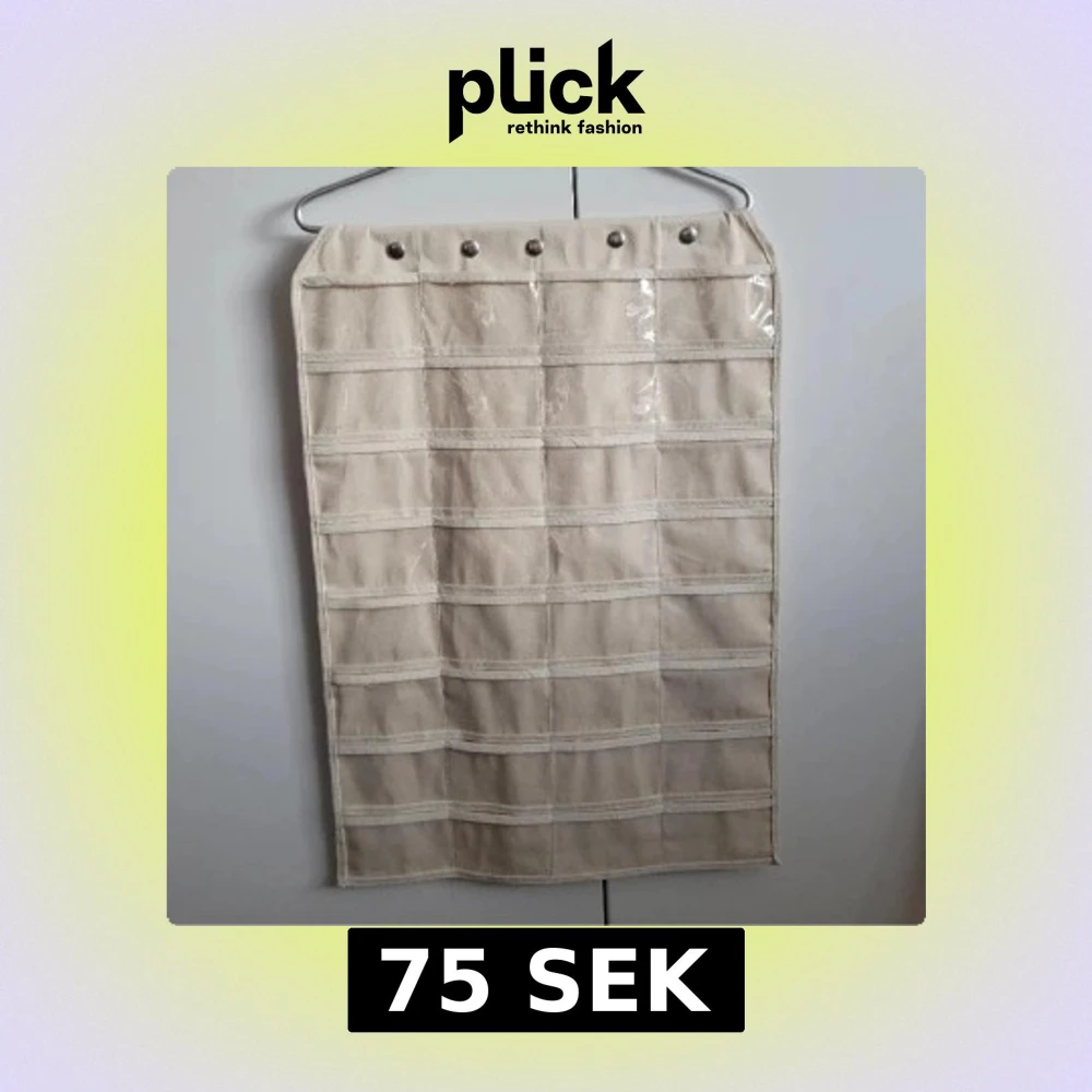 Förvaringshängare till små grejer tex smycken, pyssel, samling, pärlor, etc. Kan hängas upp. Fickor på båda sidor så väldigt många rutor. Kan tas bort från hängaren.
