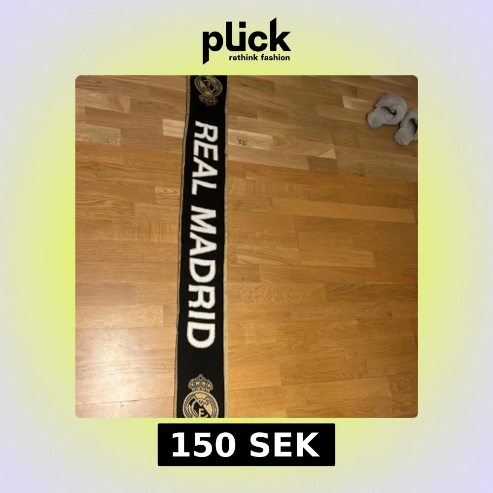 Snygg halsduk från Real Madrid i svart med guldiga detaljer och klubbens logga i båda ändar. Tjockt stickad med fransar i ändarna och stora vita bokstäver. Perfekt för att visa ditt stöd på matchen eller hänga upp på väggen.