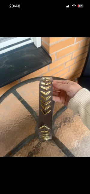 Snyggt brunt bälte i skinn med bred form och coola guldiga metalldekorationer i pilform längs hela bandet. Perfekt för att ge din outfit en unik touch och passar till jeans eller klänning. Bältet har en stilren och modern vibe. Använd 2 gånger