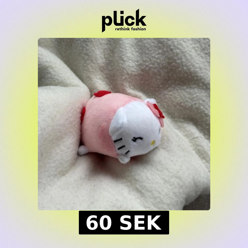 Söt Hello Kitty-mjukis i rosa och vitt med röd rosett. Produkten är en mjuk leksak. Inga synliga defekter eller slitage. Perfekt för samlare eller som present.