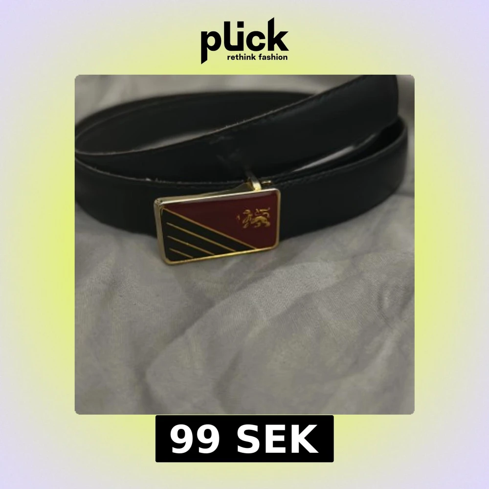 Snyggt svart bälte med en unik rektangulär spänne i guld och rött. Spännet har ett stilrent lejonmotiv och diagonala linjer. Perfekt för att ge en elegant touch till din outfit. 100cm