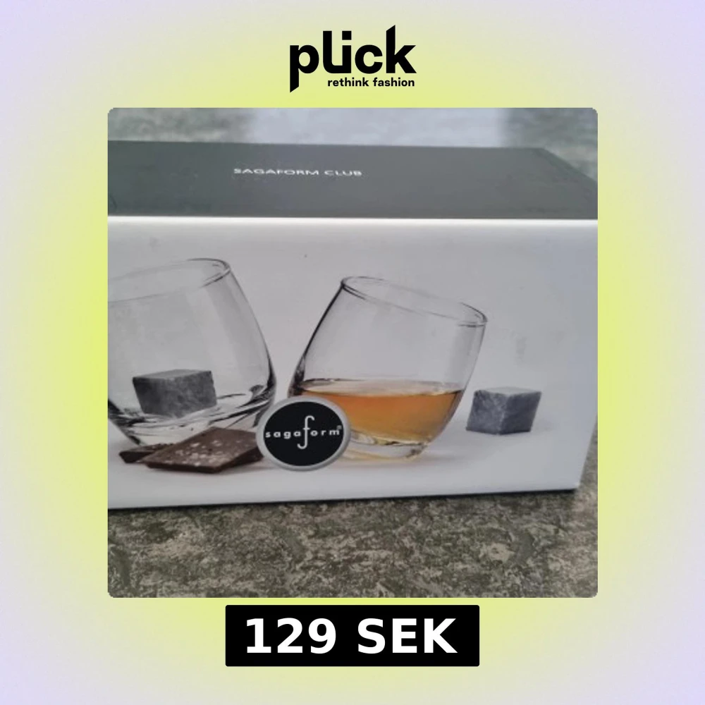 Säljer ett stilrent set med två glas från Sagaform Club. Glasen är runda och tillverkade i klart glas, perfekta för drinkar eller whiskey. Setet kommer med dekorativa stenar och presentförpackning med prickigt papper, etikett och svart band.