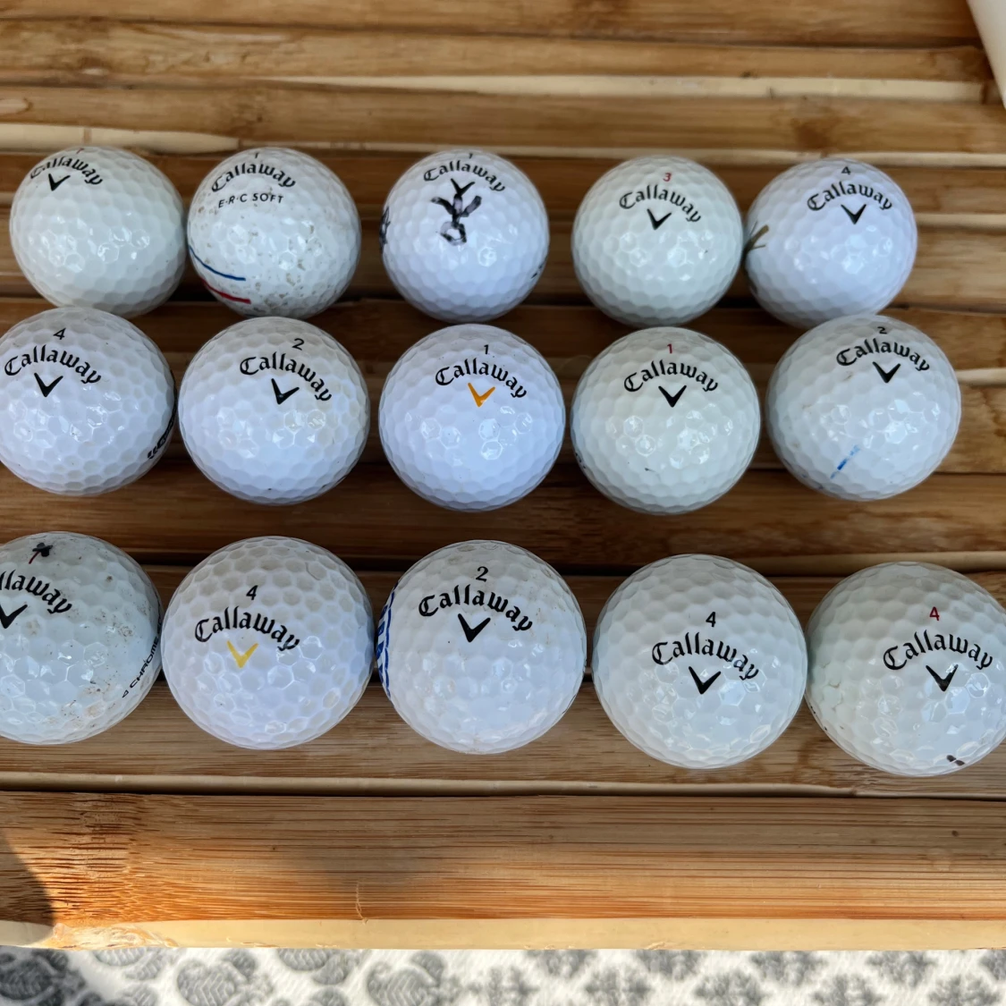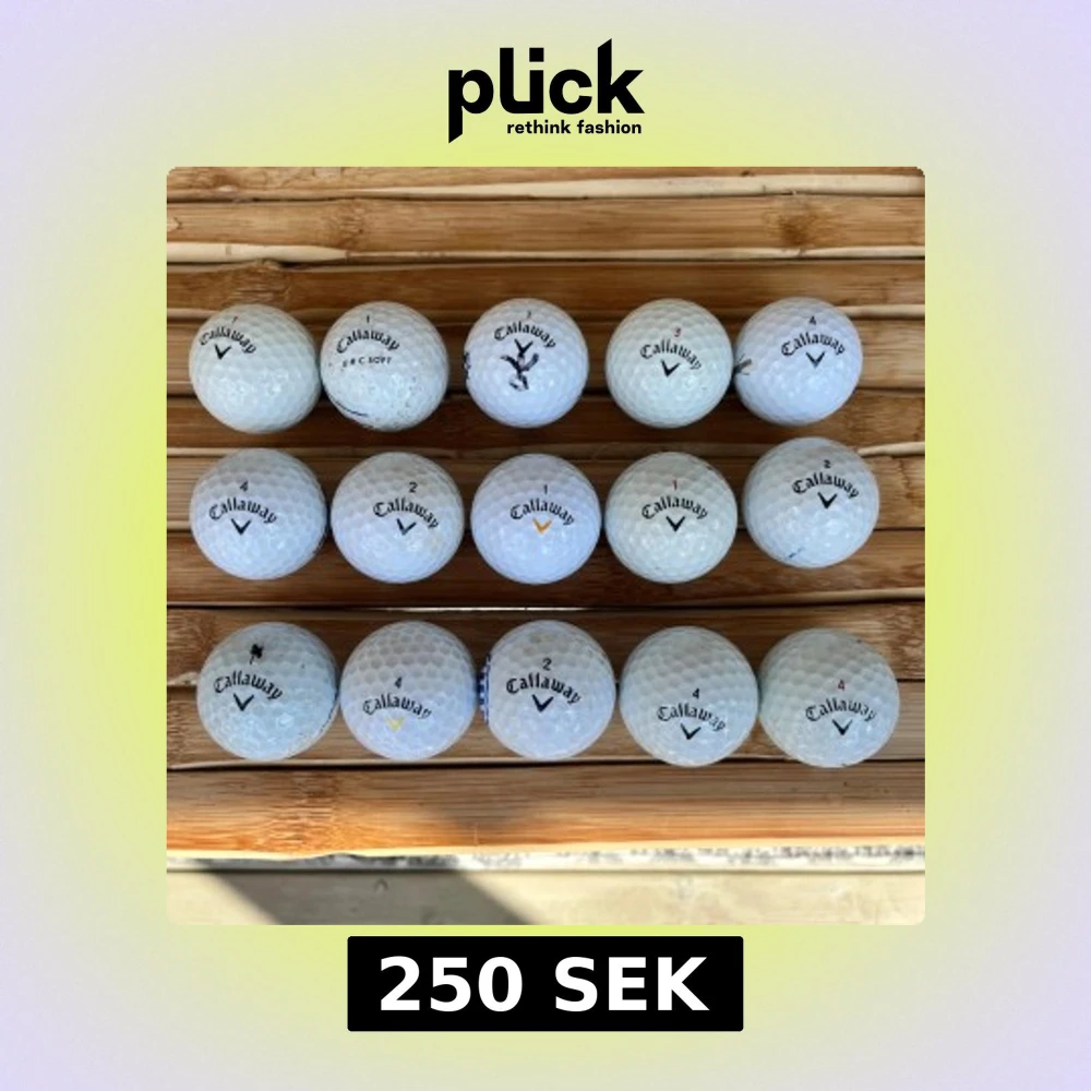 Bilderna visar ett set med 16 st fina Callaway golfbollar, perfekta för dig som vill ta din golf till nästa nivå. Bollarna är i olika skick och har tydliga Callaway-loggor. Ett måste för sportintresserade ungdomar och unga vuxna som gillar att vara aktiva utomhus.