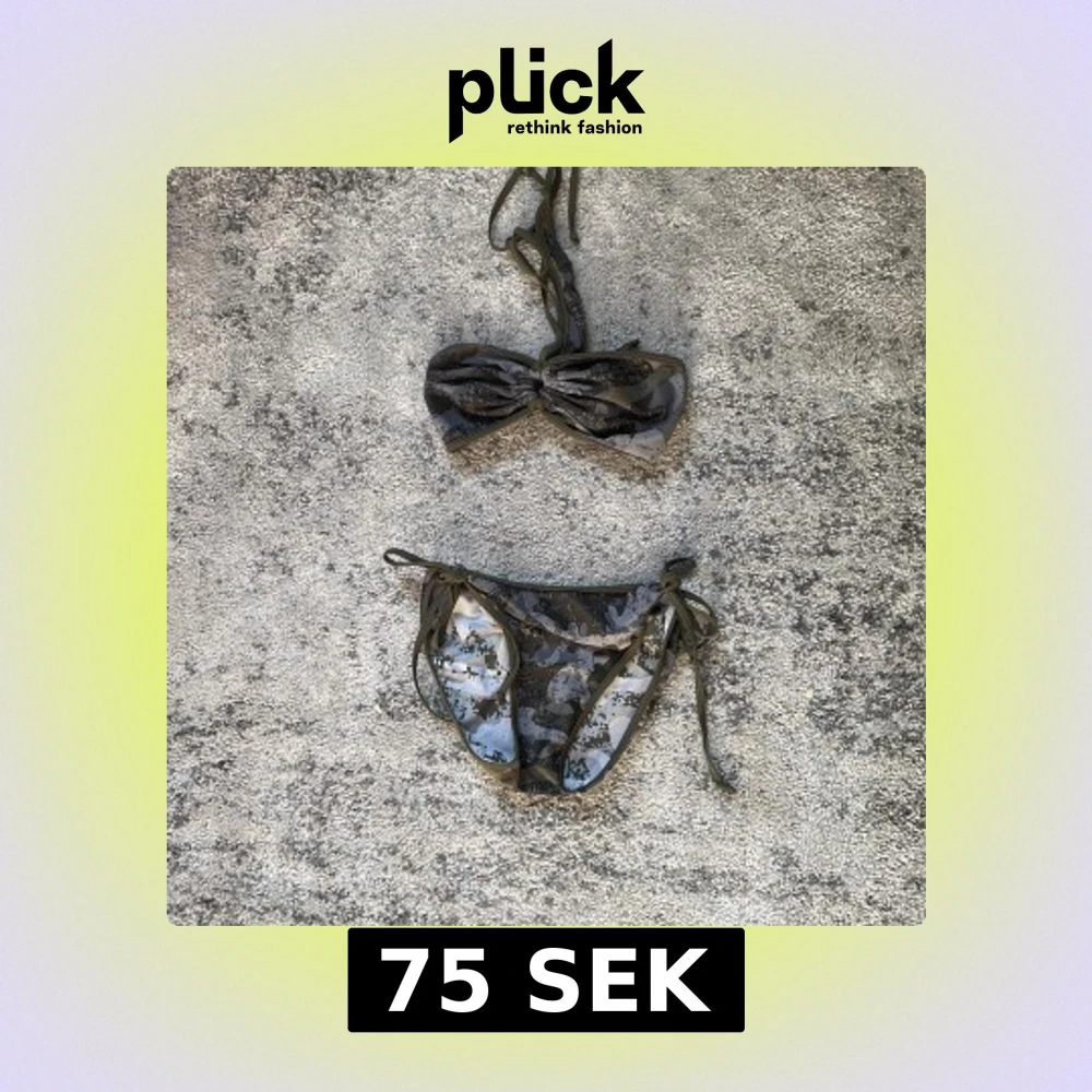 Snygg bikini i camouflage-mönster med grå, svarta och gröna toner. Överdelen är bandeau-modell med knyt i nacken och baktill, medan underdelen har knyt i sidorna. Perfekt för stranden eller poolen och ger en cool vibe.