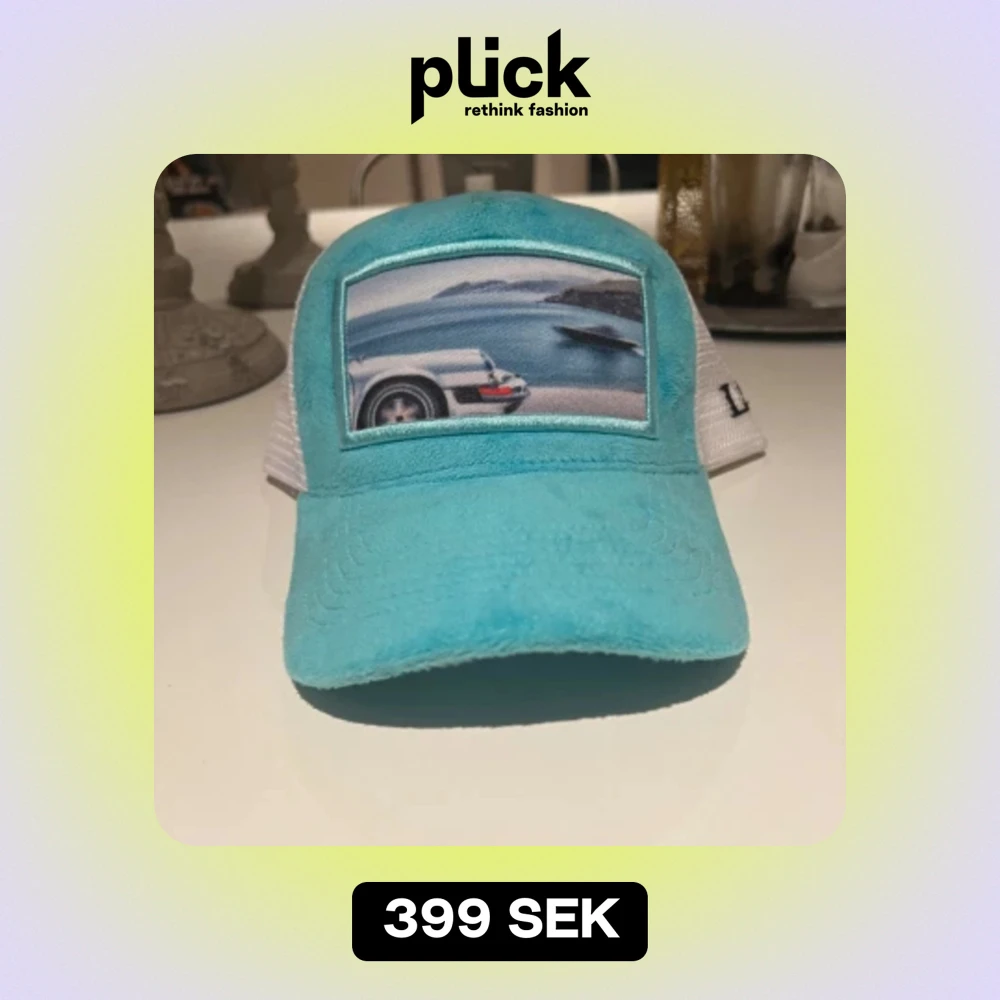 Lite använd men inga skador. Ljusblå velvet keps med tryck av en Porsche på.